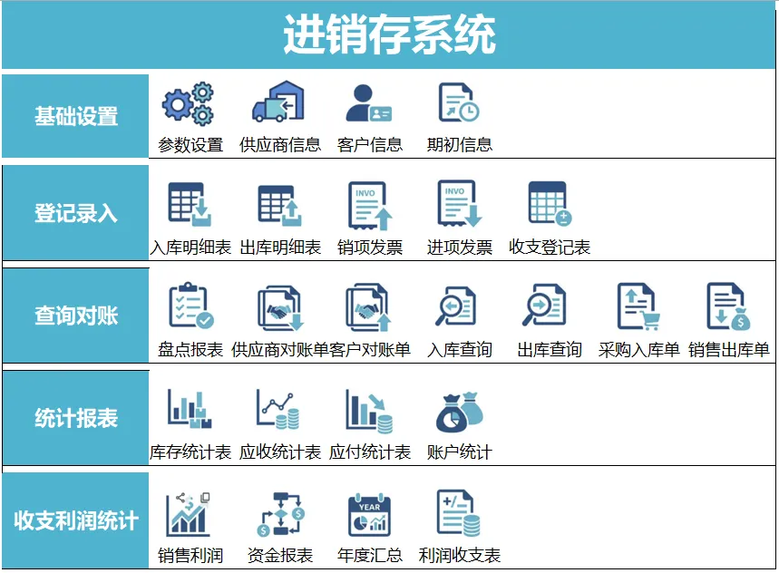 登记录入:日常所有业务操作的入口(入库、出库、发票、收支)。