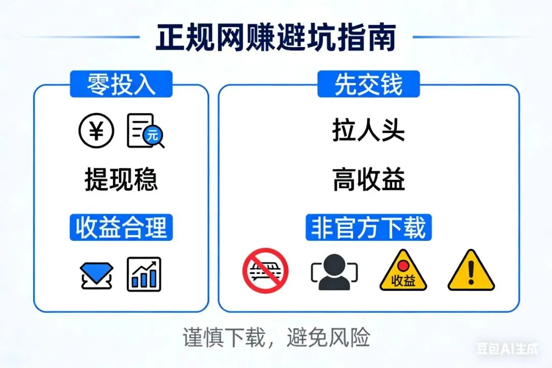 避坑指南:正规网赚必须是零投入、提现稳、收益合理的;凡先交钱、拉人头、高收益、非官方下载的都要谨慎下载。