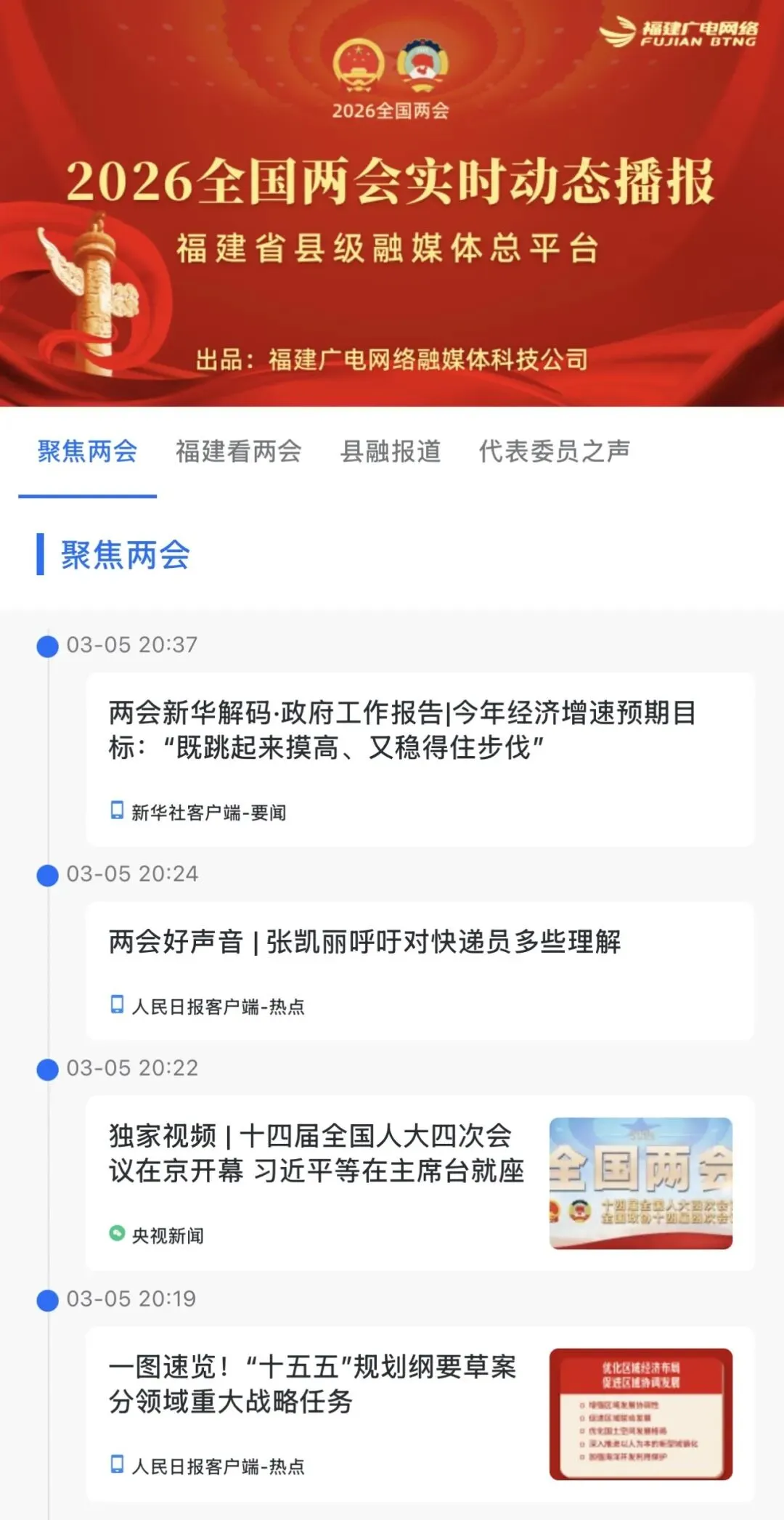 依托福建省县级融媒体总平台的强大技术支撑,聚合全省县融力量,为你带来最新鲜、最全面的两会实时动态。板块内设 “聚焦两会”、“福建看两会”、“县融报道”等子栏目,从大会进程到福建声音,从基层视角到权威发布,一屏掌握两会全脉络。