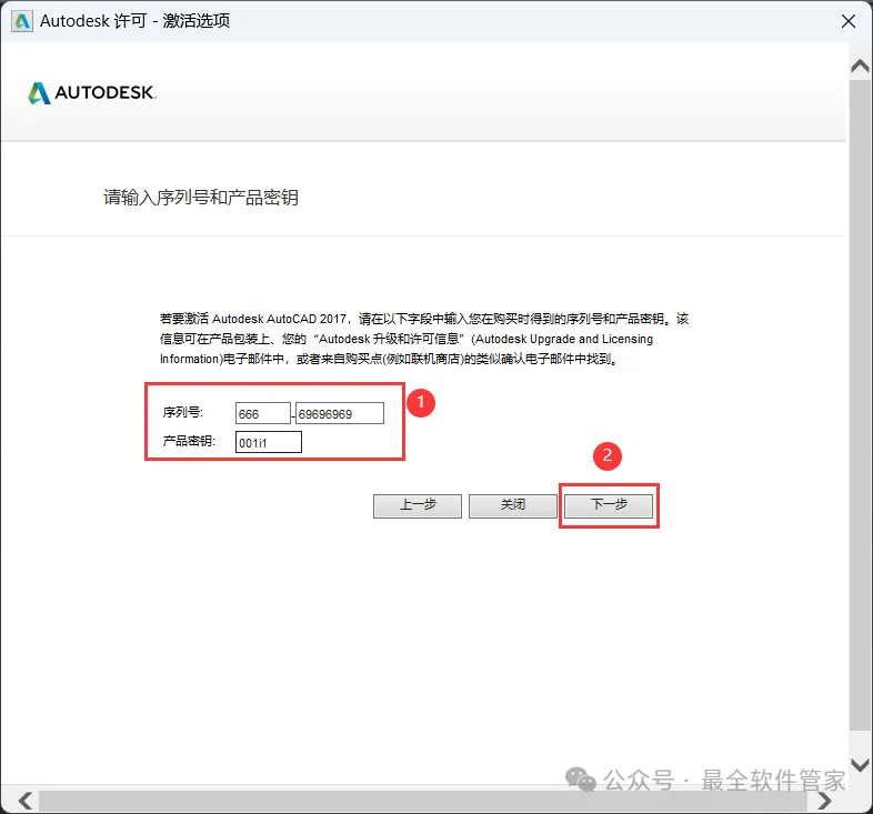 15、序列号输入:666-69696969,产品密钥输入:001i1,再点击【下一步】