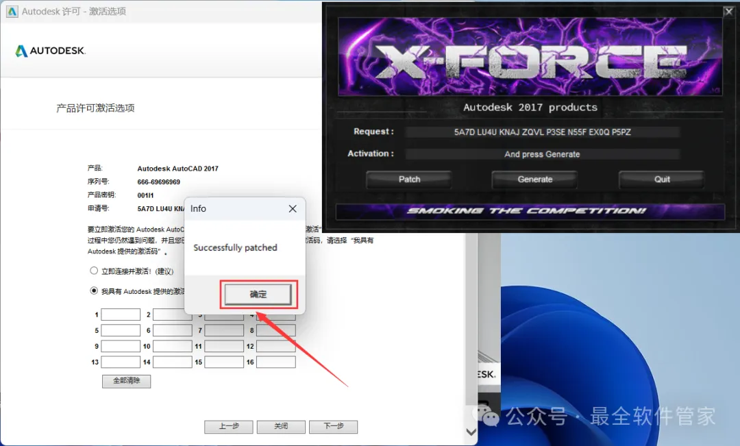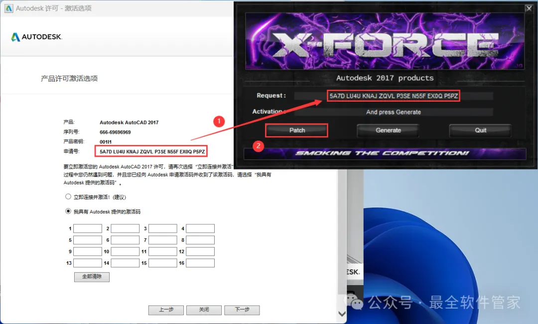 24、打开软件界面,将软件的【申请号】填入到程序的【Requset】内,再点击【Patch】