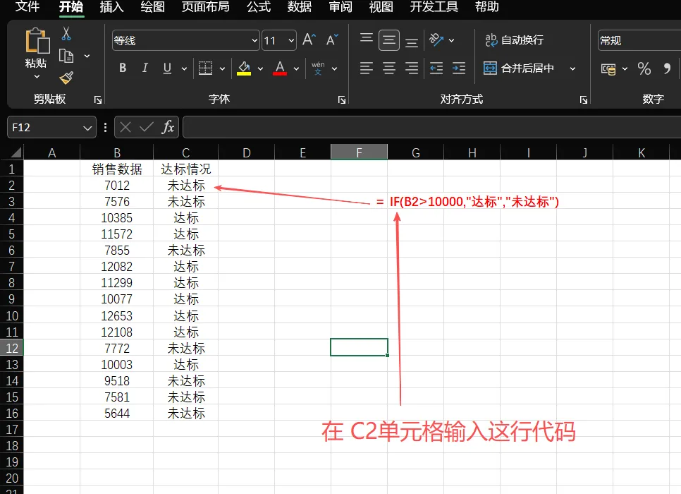 =IF(B2>=10000,"达标","未达标")