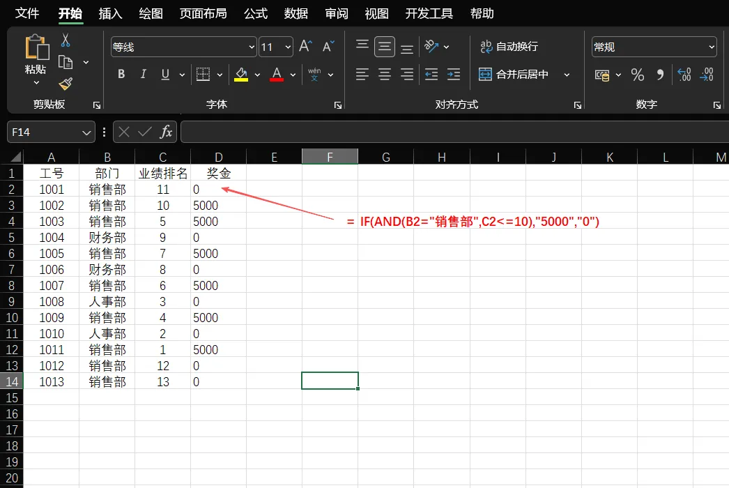 场景痛点:财务计算年终奖时,规则往往很复杂。例如:只有“销售部”且“业绩排名前10”的员工才能获得奖金5000元。单一的IF函数已经无法满足这种“既要又要”的需求。