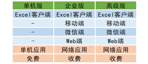 从上图中可以清晰看到:单机版免费且仅支持 Excel 客户端,适合个人学习;企业版与高级版支持全客户端,适合团队协同与复杂业务场景。