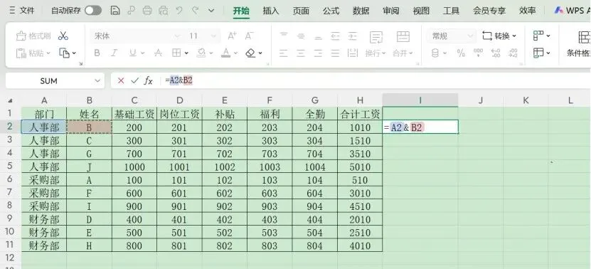 这个技巧很简单,首先,在空白单元格(如下图I2)输入等号“=”,接着选中第一个单元格内容(如下图A2),然后输入“&”这个符号,再选中第二个单元格内容(如下图B2)。