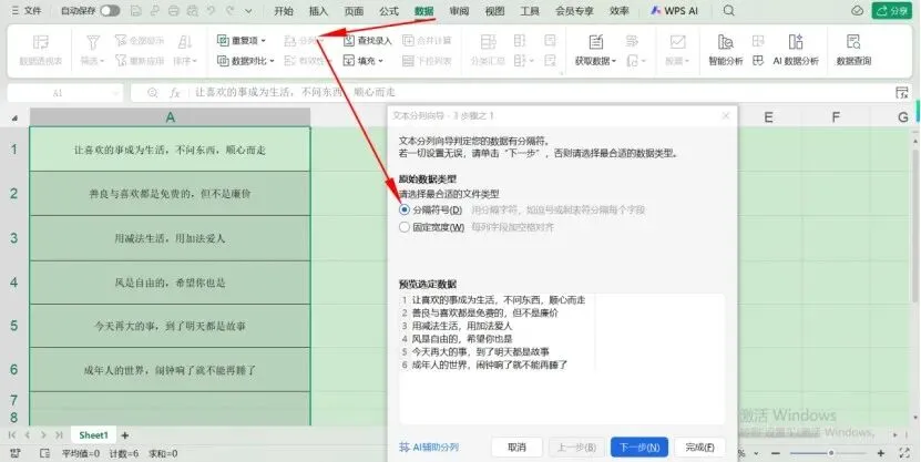 那如何进行拆分呢,这就要用到“分列”功能了。