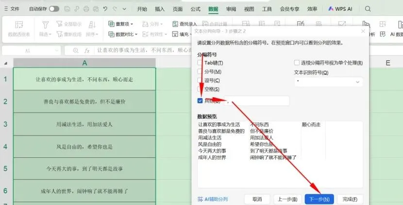 在弹出的菜单里,有几个选项,根据情况进行选择,比如图片里的A列,句与句之间是用“,”相连,那么拆分的话,就在“其他”这个选项里填写逗号。