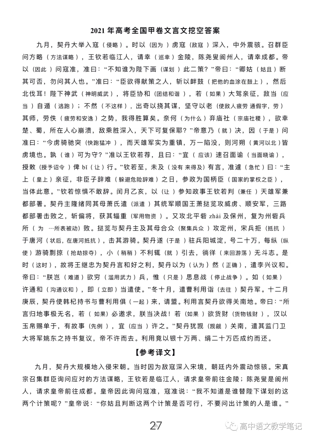 近五年高考文言文真题挖空练习及翻译(可打印)