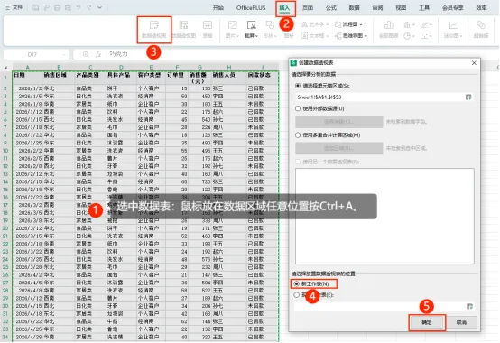 3. 在弹出对话框,选择透视表保存位置,点击「确定」。(推荐选保存在新工作表,方便后续编辑。)