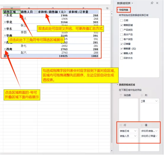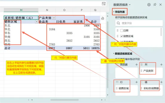 透视表的核心的就是字段拖拽,右侧字段列表里的每一项,都对应原始数据的表头,我们只需把字段拖到对应的“区域”,就能自动生成统计结果。