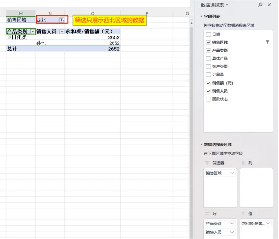 例3:以“销售区域”为筛选器、查看各个销售的各个产品的销售额。