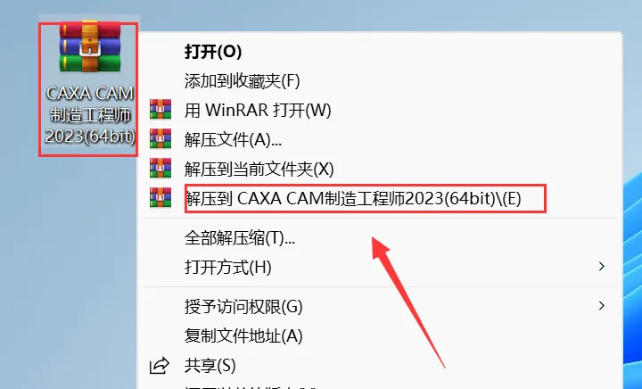 1.鼠标右击【CAXA CAM制造工程师2023(64bit)】压缩包,选择【解压到CAXA CAM制造工程师2023(64bit)】。