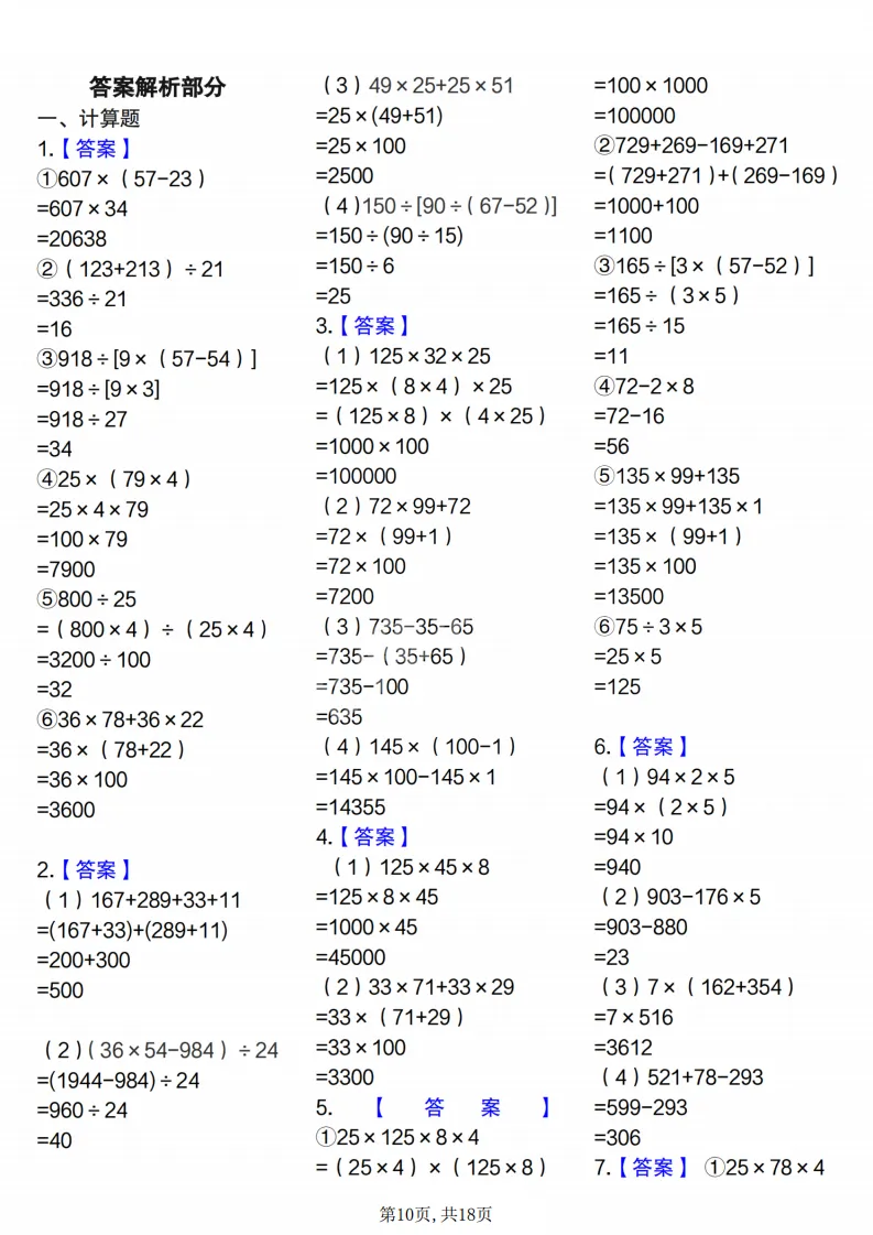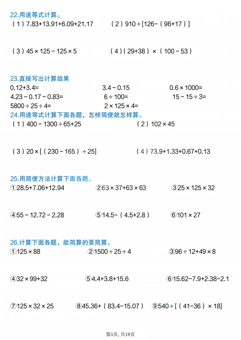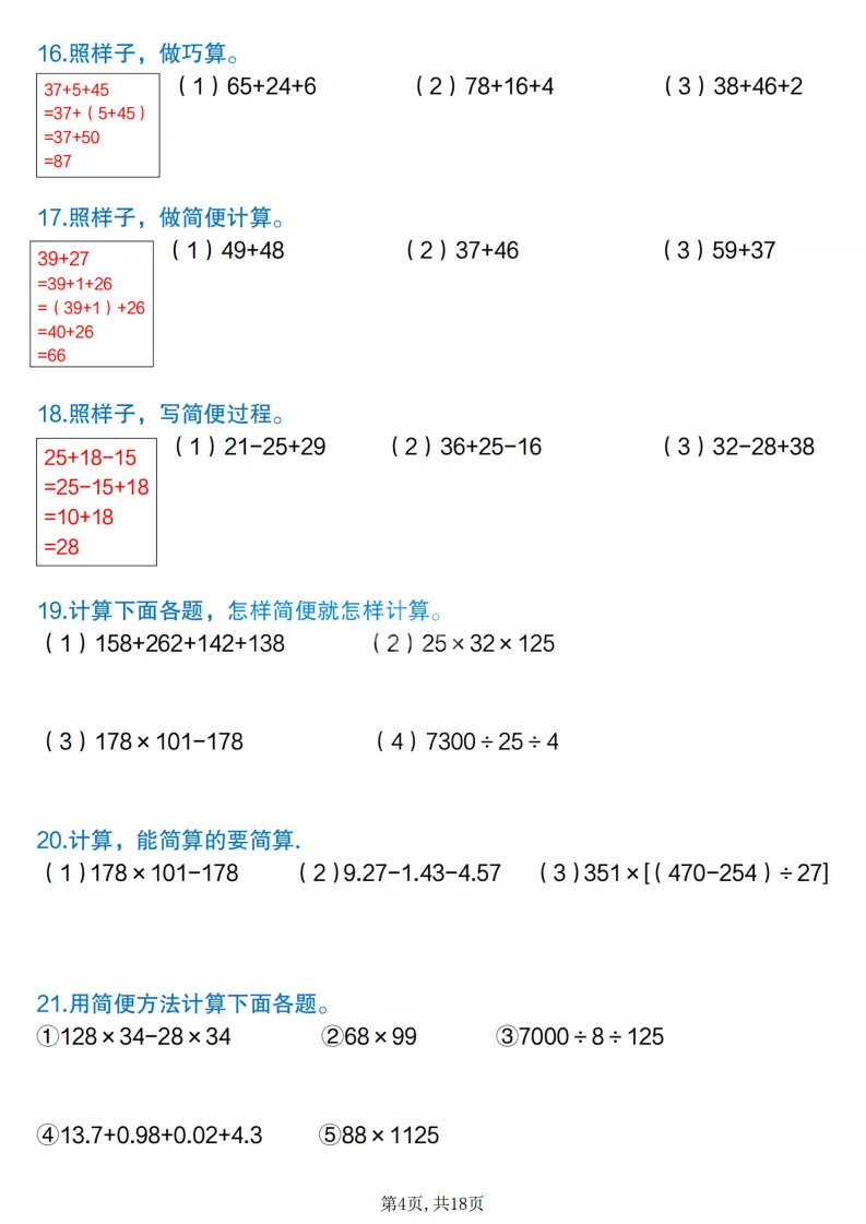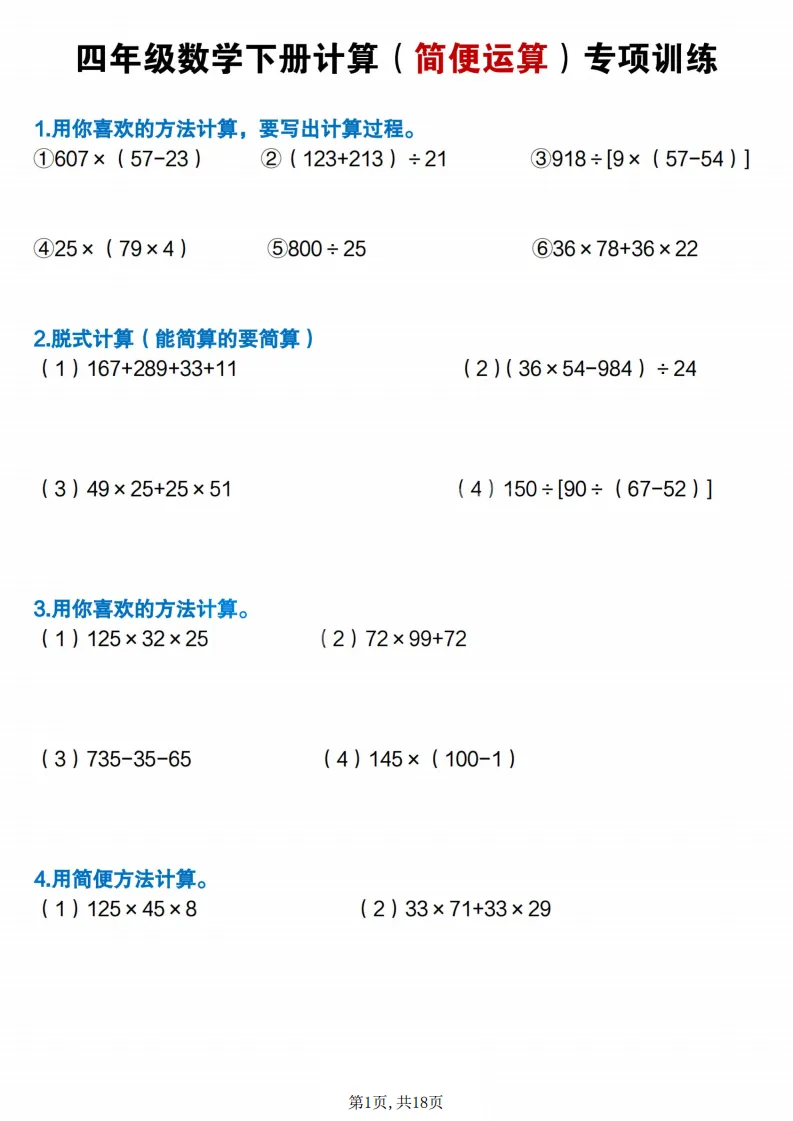 四年级(下)数学简便计算专项练习,电子版可打印 点击上方关注领取更多学习资源 四年级(下)数学简便计算专项练习,电子版可打印,电子版可下载,同步教材,需要的家长可以打印出练一练。 (温馨提示:文末有完整电子版领取方式) 免费领取电版 关注公众号:“博学小课堂” 文章文末:点赞+再看 发送关键字:260305