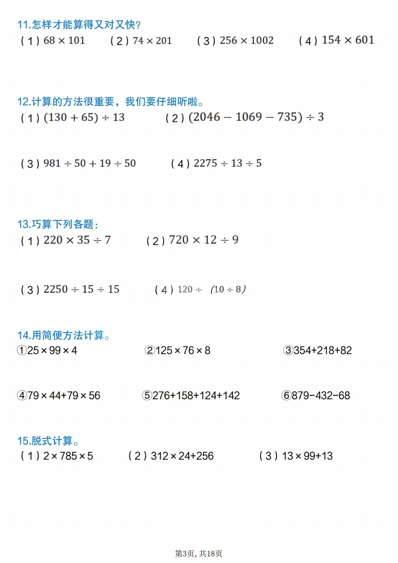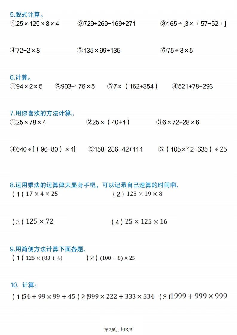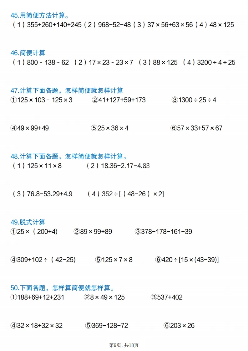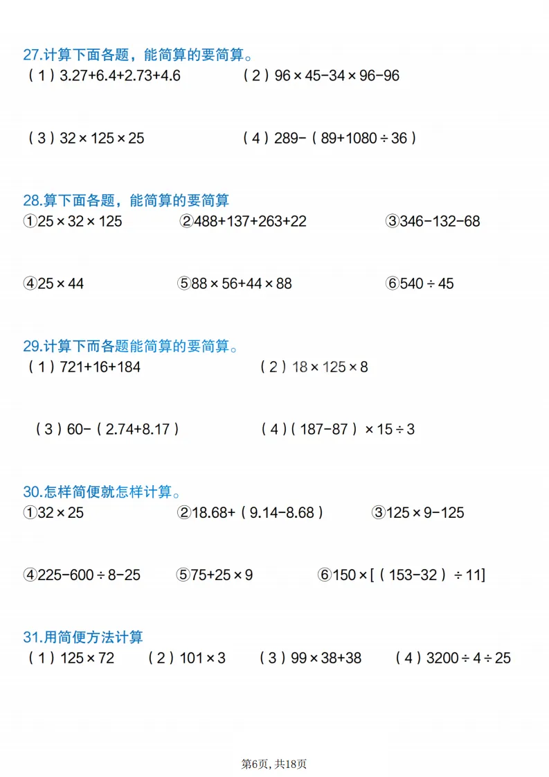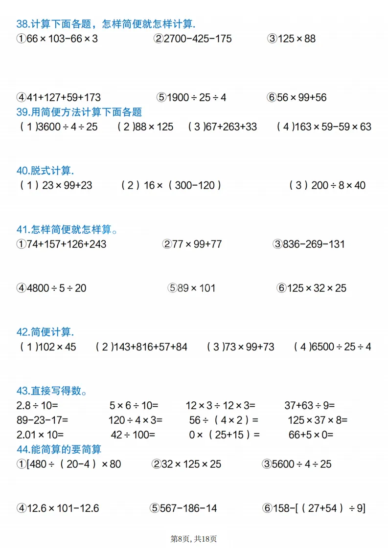 四年级(下)数学简便计算专项练习,电子版可打印 点击上方关注领取更多学习资源 四年级(下)数学简便计算专项练习,电子版可打印,电子版可下载,同步教材,需要的家长可以打印出练一练。 (温馨提示:文末有完整电子版领取方式) 免费领取电版 关注公众号:“博学小课堂” 文章文末:点赞+再看 发送关键字:260305