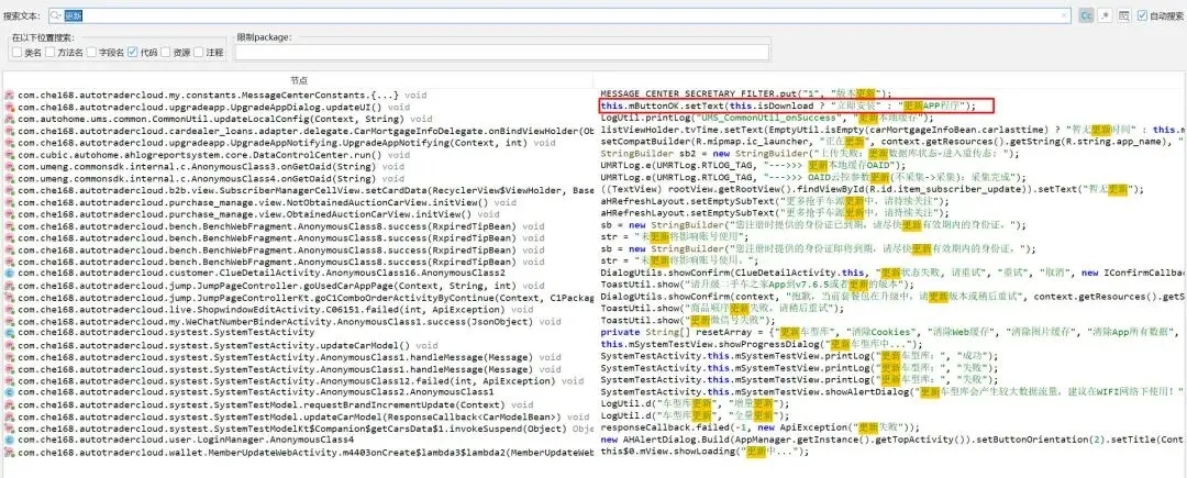 将 App 拖入反编译工具,全局搜索关键字:更新。搜索出来的结果要根据弹窗内容来判断