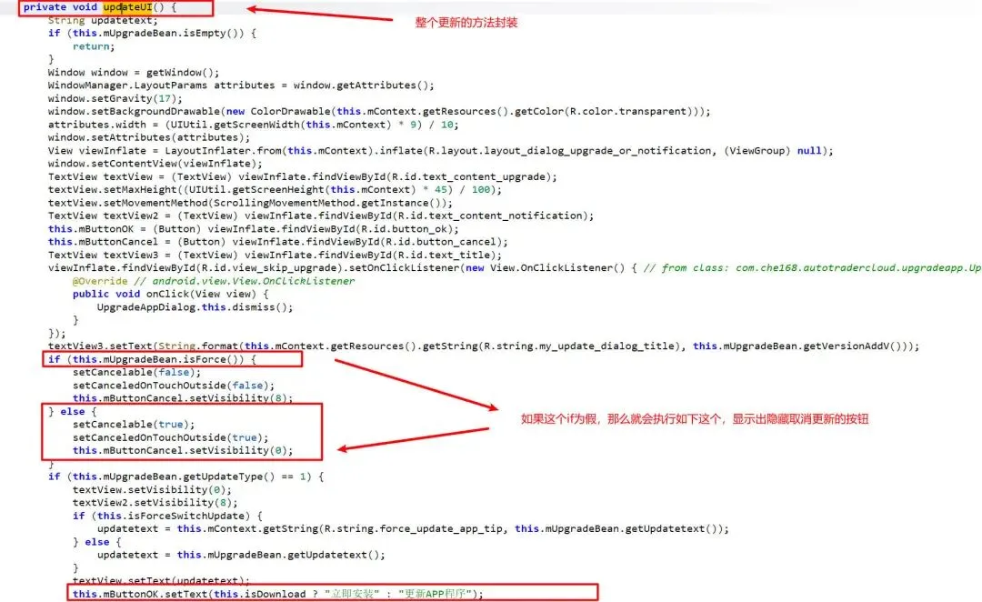 进一步查看代码,发现了一行关键判断:this.mButtonOK.setText(this.isDownload ? "立即安装" : "更新APP程序");。这行代码存在于 updateUI() 方法中。