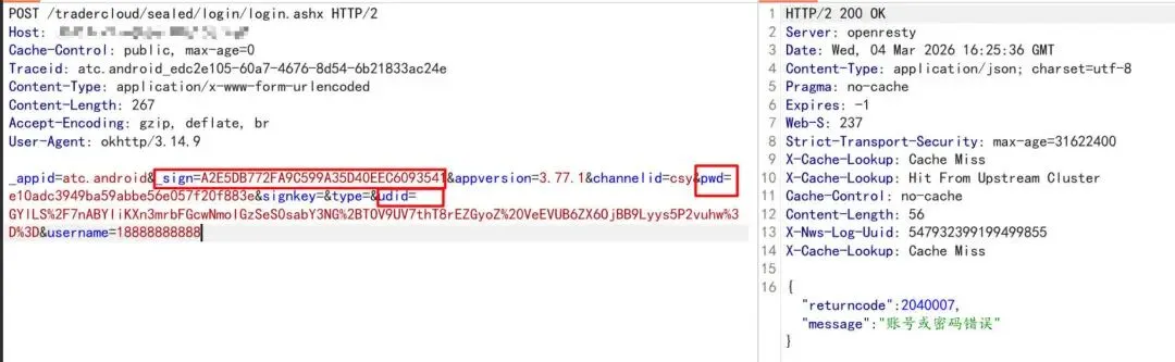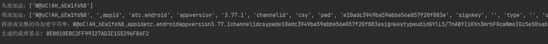 import hashlib# 预设的盐值池KEY_V1 = "com.che168.www"KEY_V2 = "W@oC!AH_6Ew1f6%8"KEY_SHARE = "moc.861ehc.relaed.bup.wyfv"KEY_AUTOHOME = "@7U$aPOE@$"def generate_sign(sign_type: int, param_map: dict) -> str:if param_map is None:return ""# 1. 根据 signType 匹配 Saltsalt = KEY_V1if sign_type == 1:salt = KEY_V2elif sign_type == 2:salt = KEY_SHAREelif sign_type == 3:salt = KEY_AUTOHOMEsb = []# 2. 头部加盐sb.append(salt)# 3. 按字典序排序并拼接 Key 和 Valuefor key in sorted(param_map.keys()):sb.append(str(key))value = param_map[key]# 容错处理:None 转空串sb.append(str(value) if value is not None else "")# 4. 尾部加盐sb.append(salt)raw_string = "".join(sb)# print(f"[*] 待加密字符串:{raw_string}")# 5. MD5 加密并转大写md5_hash = hashlib.md5(raw_string.encode('utf-8'))return md5_hash.hexdigest().upper()if __name__ == "__main__":# 填入抓包拿到的实际参数进行测试sample_params = {"_appid": "atc.android","appversion": "3.77.1","channelid": "csy","pwd": "e10adc3949ba59abbe56e057f20f883e","signkey": "","type": "","udid": "GYlLS/7nABYIiKXn3mrbFGcwNmoIGzSeS0sabY3NG+TOV9UV7thT8la/ua0W sWvd/hVbDvD3SOvXz11mDUae2g==","username": "18888888888"}signature = generate_sign(1, sample_params)print(f"[+] Python 还原生成的 Sign: {signature}")