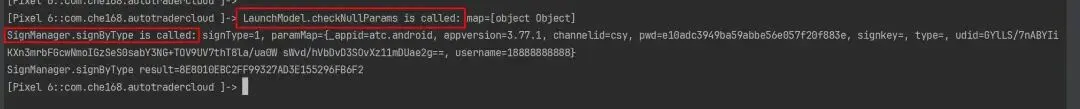 重新触发网络请求,控制台成功打印出日志。根据日志顺藤摸瓜,确认最终生成 Sign 的核心方法是:com.che168.atclibrary.base.SignManager.signByType()。