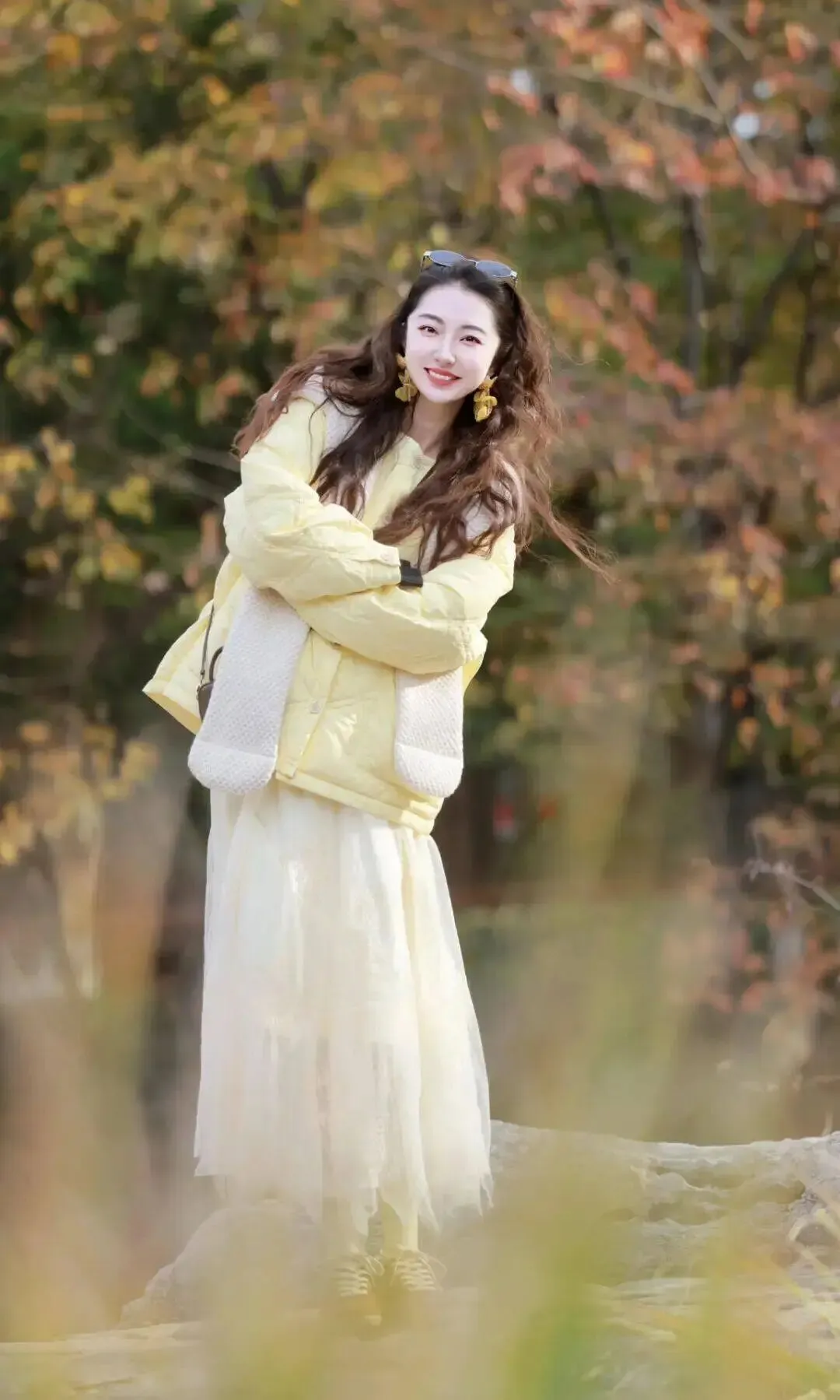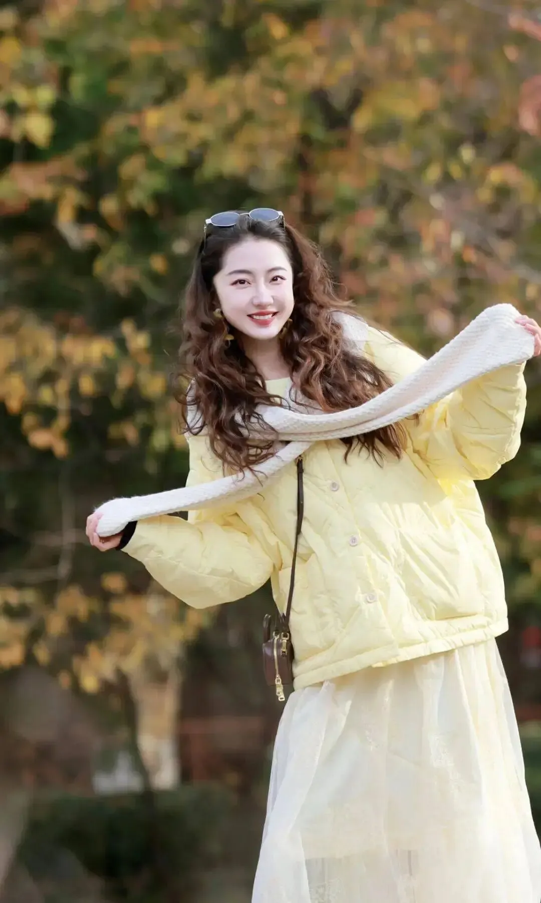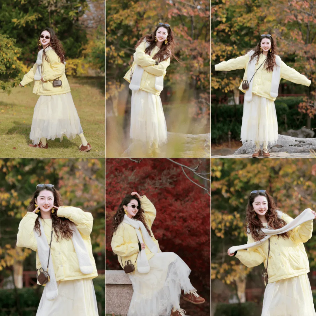 穿裙子拍照时加个小物件很有用,围巾就是最简单的选择,站立歪身拉围巾的时候,裙子跟围巾会一起形成柔和的线条,看上去很自在,歪身的动作轻轻的就能显得修长好看,整个画面会多一点温度,特别适合秋冬的裙装。