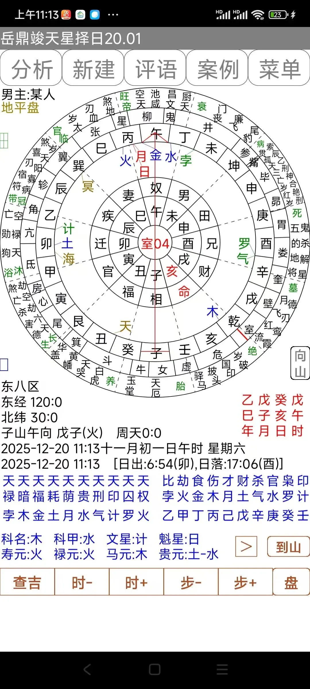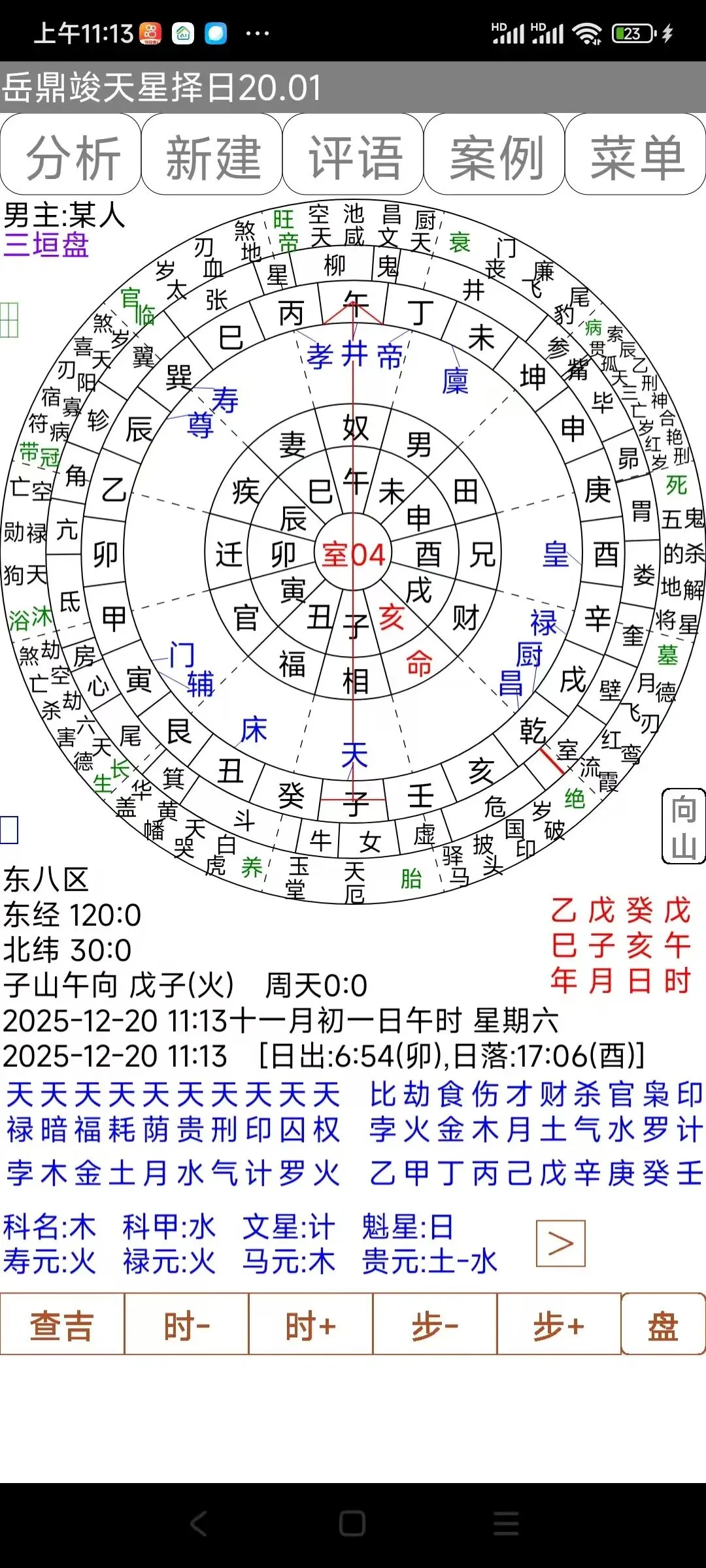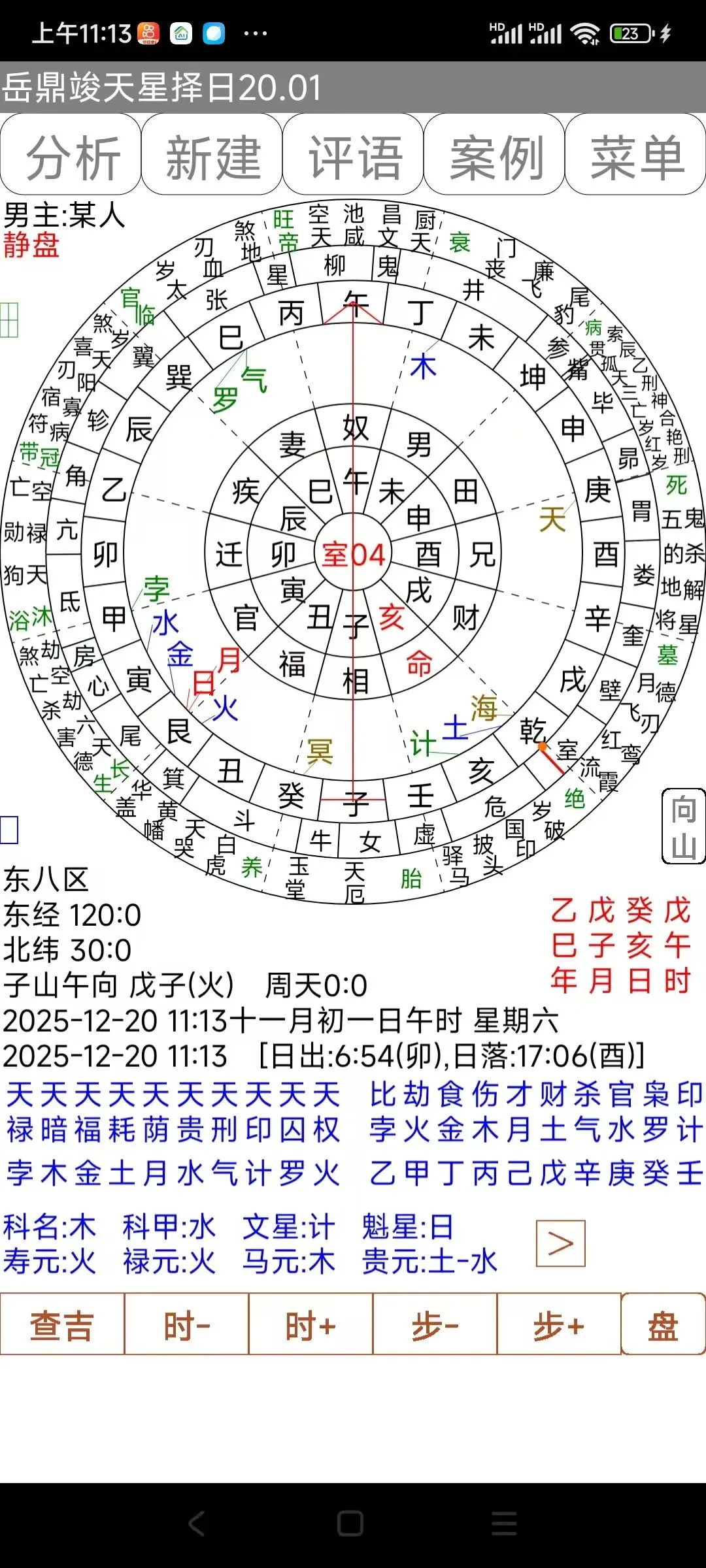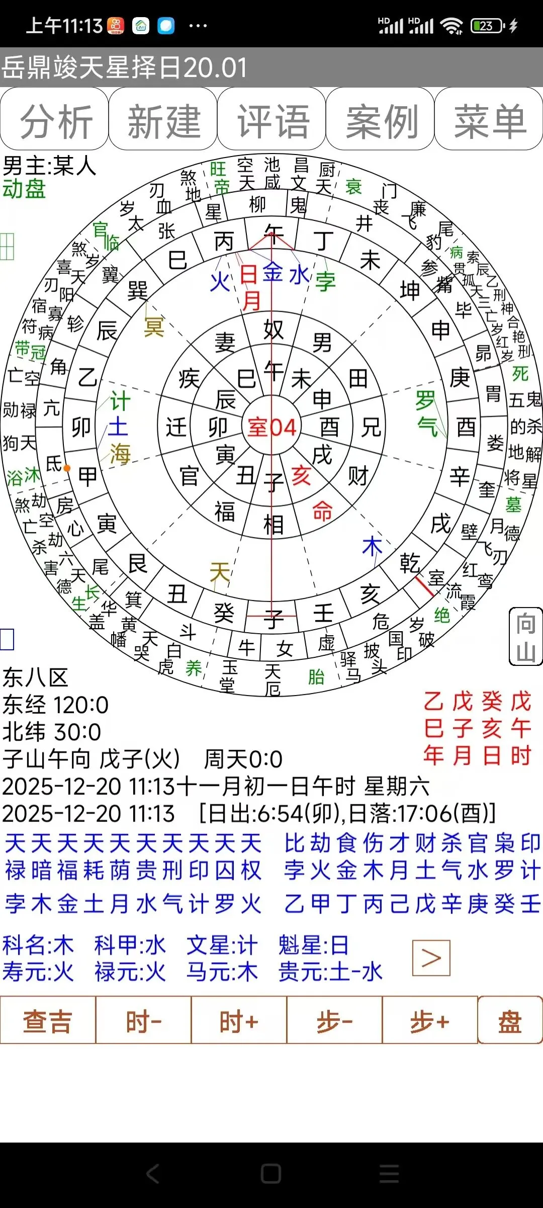6:圆盘模式下,点击星盘12宫,可以查看该宫的纳音、神煞等。点击二十八宿,会显示该宿度主。都在星盘右上角显示。