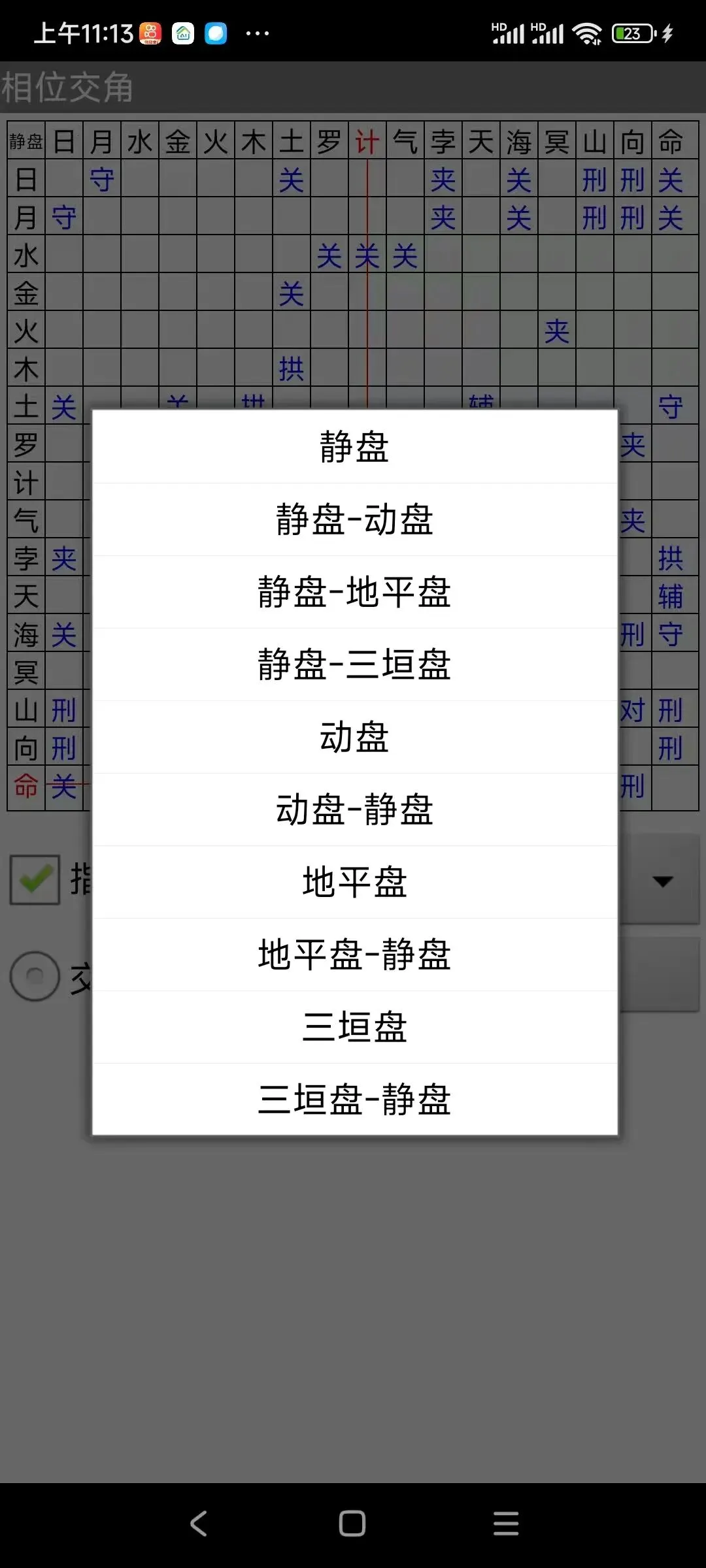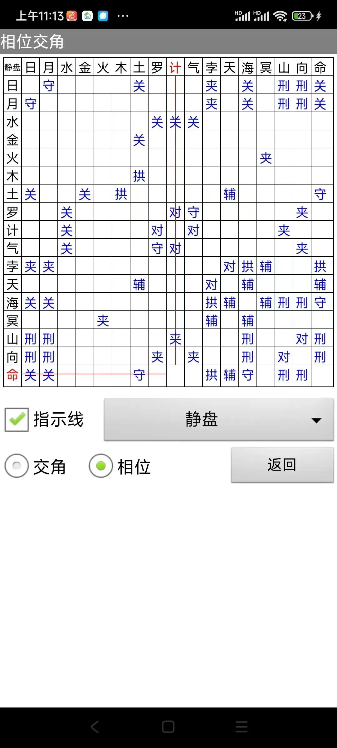 16:点右下角的方框(里面有个向右的箭头),显示相位交角窗口,展示静盘、动盘、地平盘、三垣盘自身和几个盘之间的相位关系,可以查看各星曜的相位关系、交角角度。