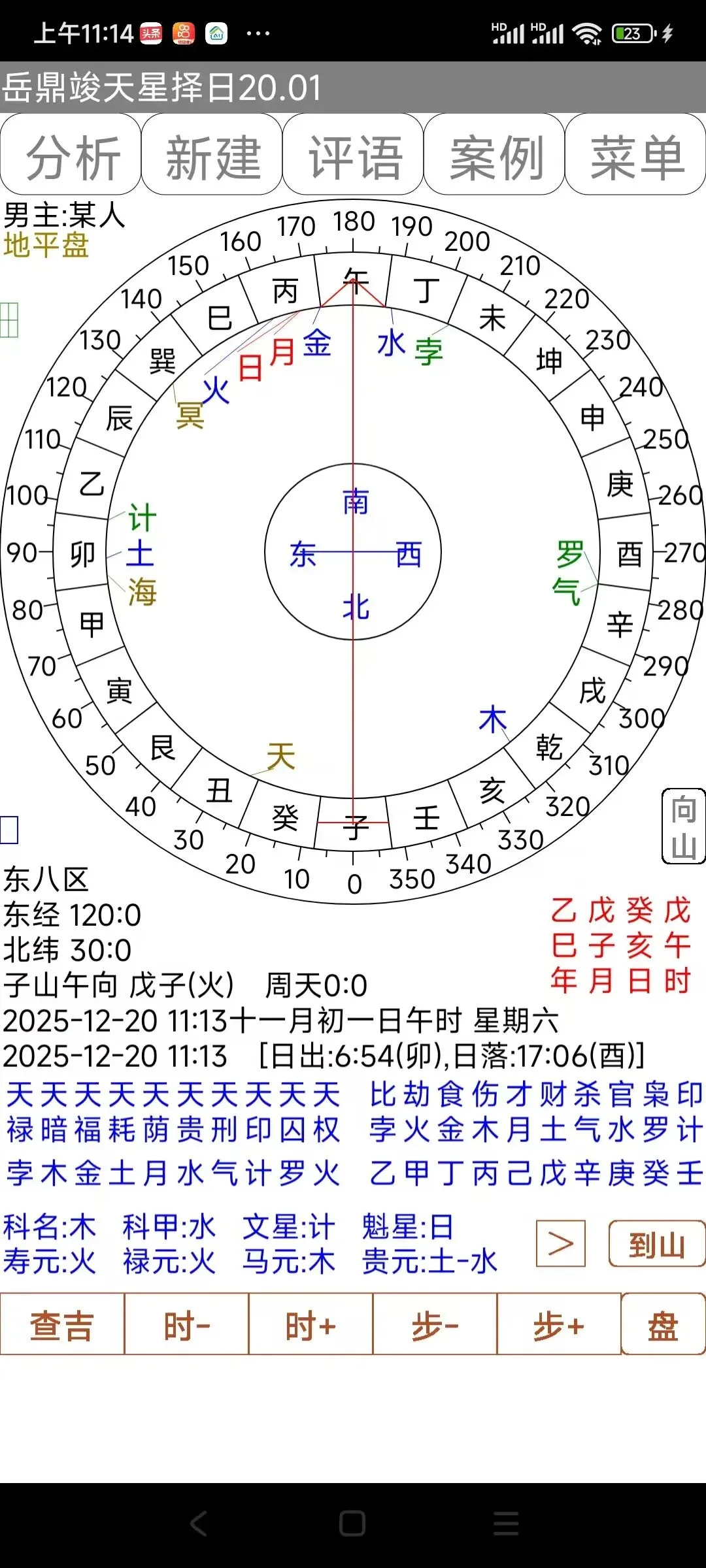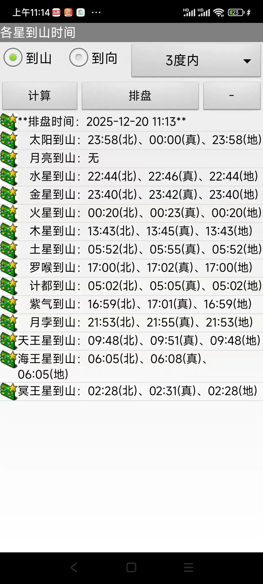 14:地平盘界面下,点击右下角的“到山”,可以查看各星到山、到向的时间