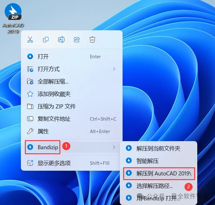 1、下载AutoCAD 2019软件安装包到电脑上,右键选择【解压到AutoCAD 2019\】