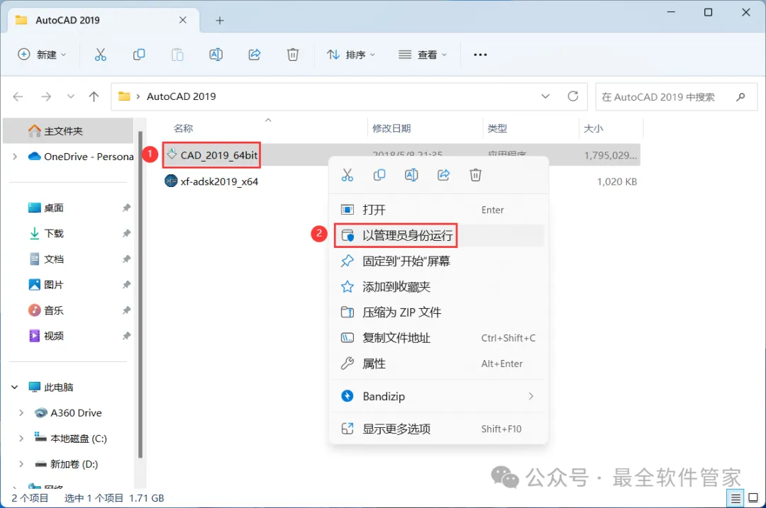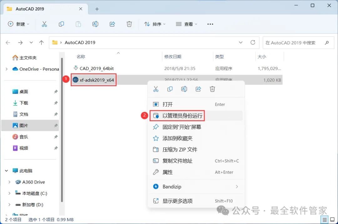 22、回到AutoCAD 2019文件夹,找到【xf-adsk2019】程序,右键选择【以管理员身份运行】它