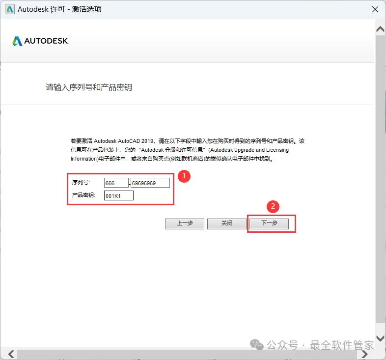 20、序列号输入:666-69696969,产品密钥输入:001K1,再点击【下一步】