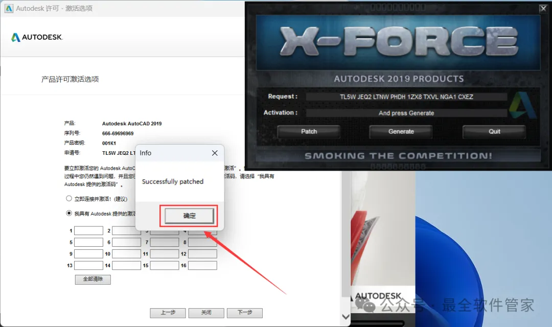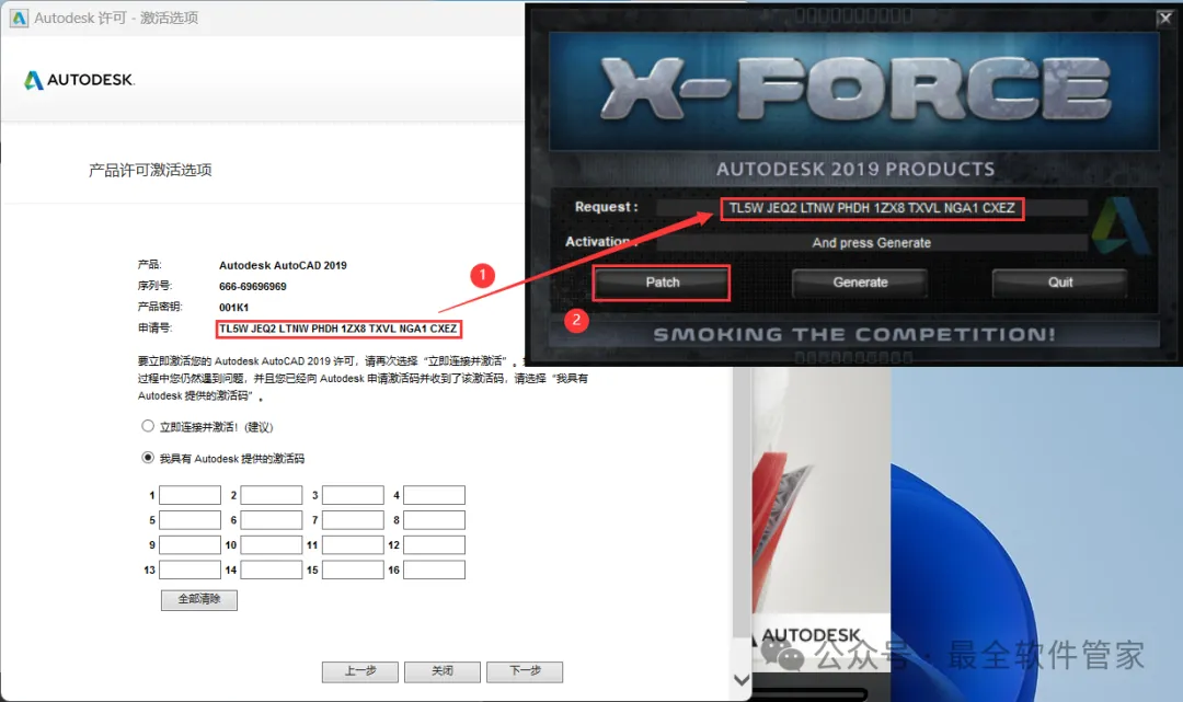 23、打开软件界面,将软件的【申请号】填入到程序的【Requset】内,再点击【Patch】