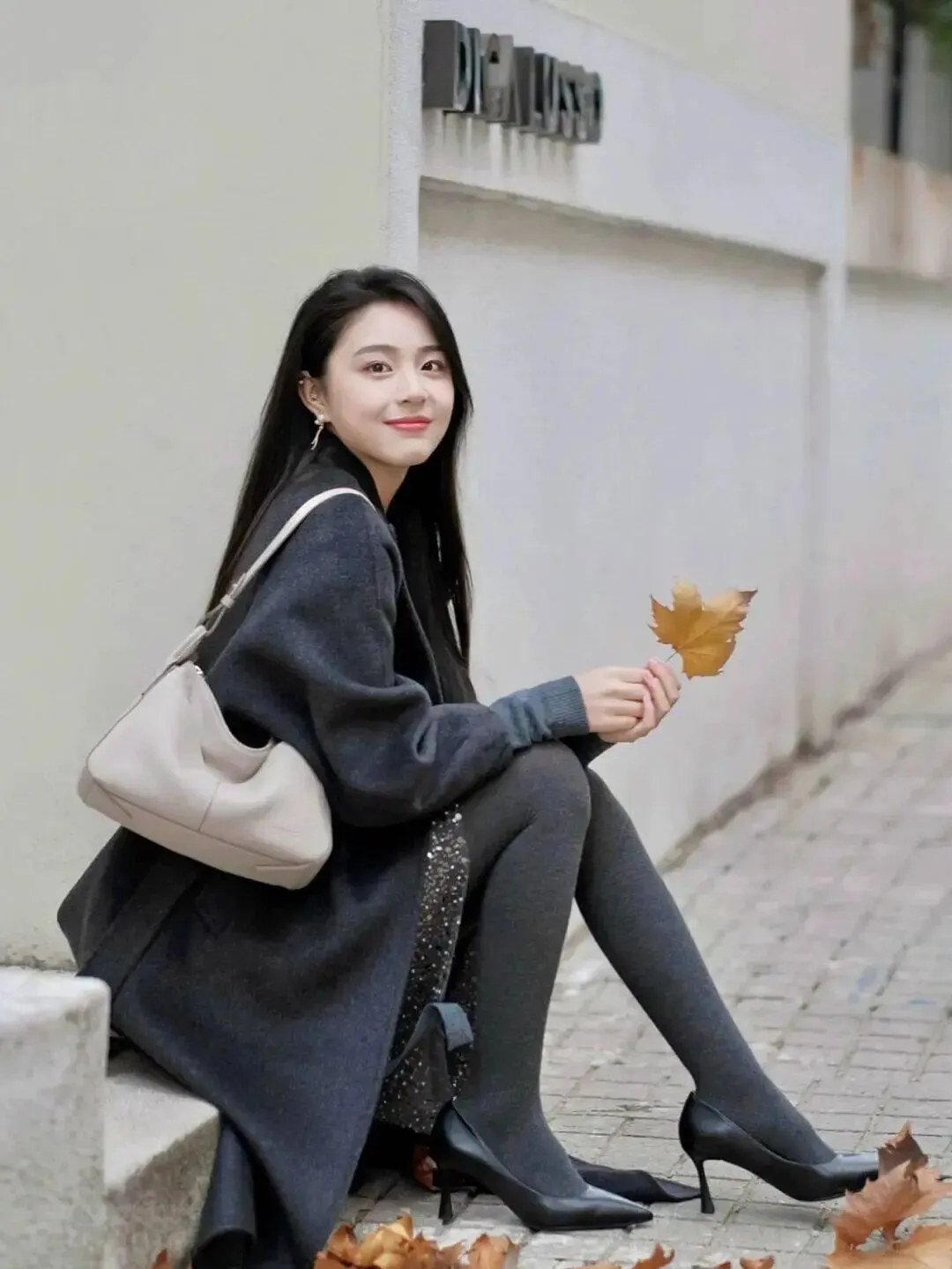 穿大衣拍照时侧坐在路边或台阶上很容易显得放松,身体微微侧着坐下,一只手自然拿着落叶,头轻轻回一点看镜头,整个人看起来不刻意,大衣的长度刚好垂下来,画面会很干净。
