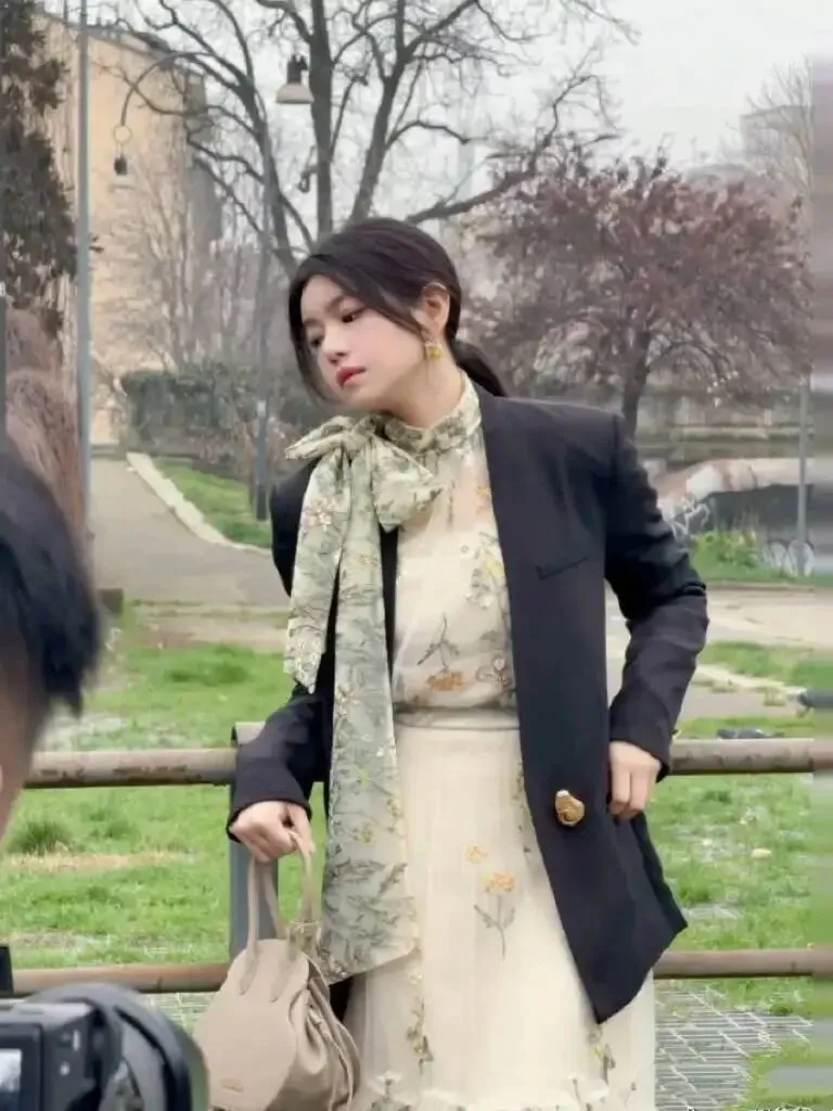 陈妍希这身打扮,简直是把春意盎然写在身上。初春季节,连衣裙+西服外套,就是如此的优雅浪漫。职场、休闲、甚至秀场,都可以美得自信从容。