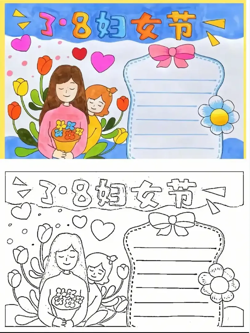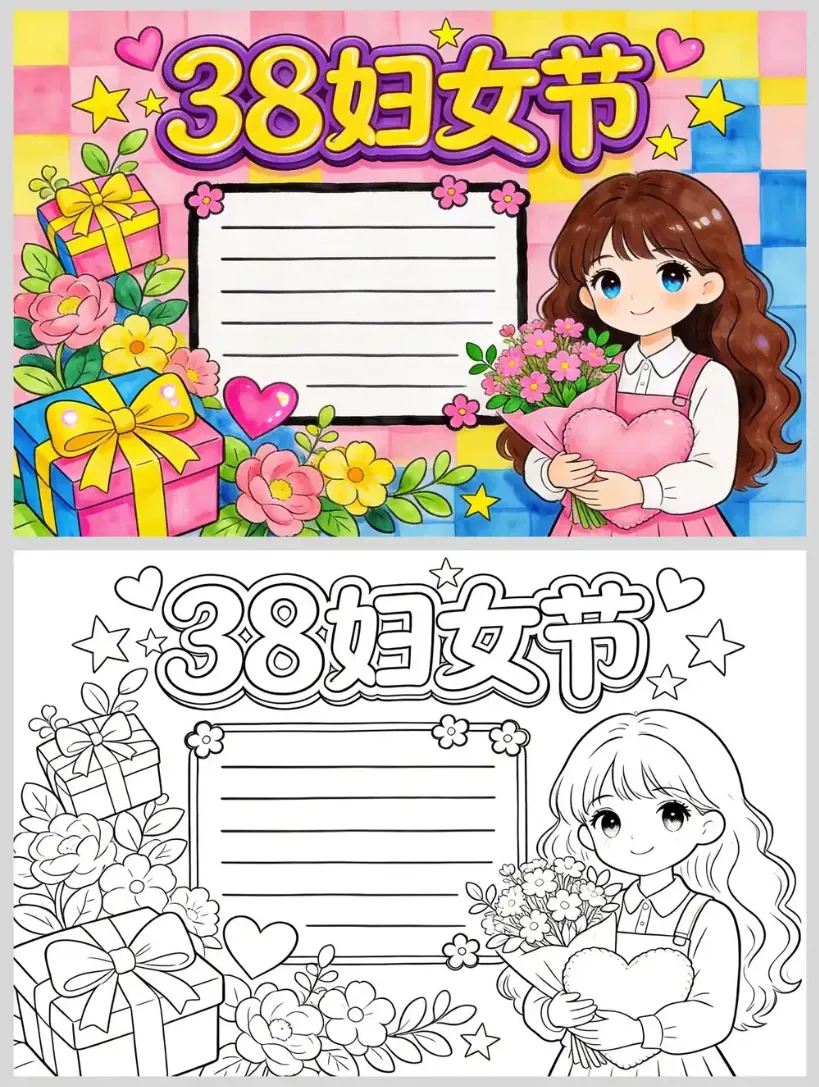2026最新38妇女节手抄报 黑白线稿可打印下载