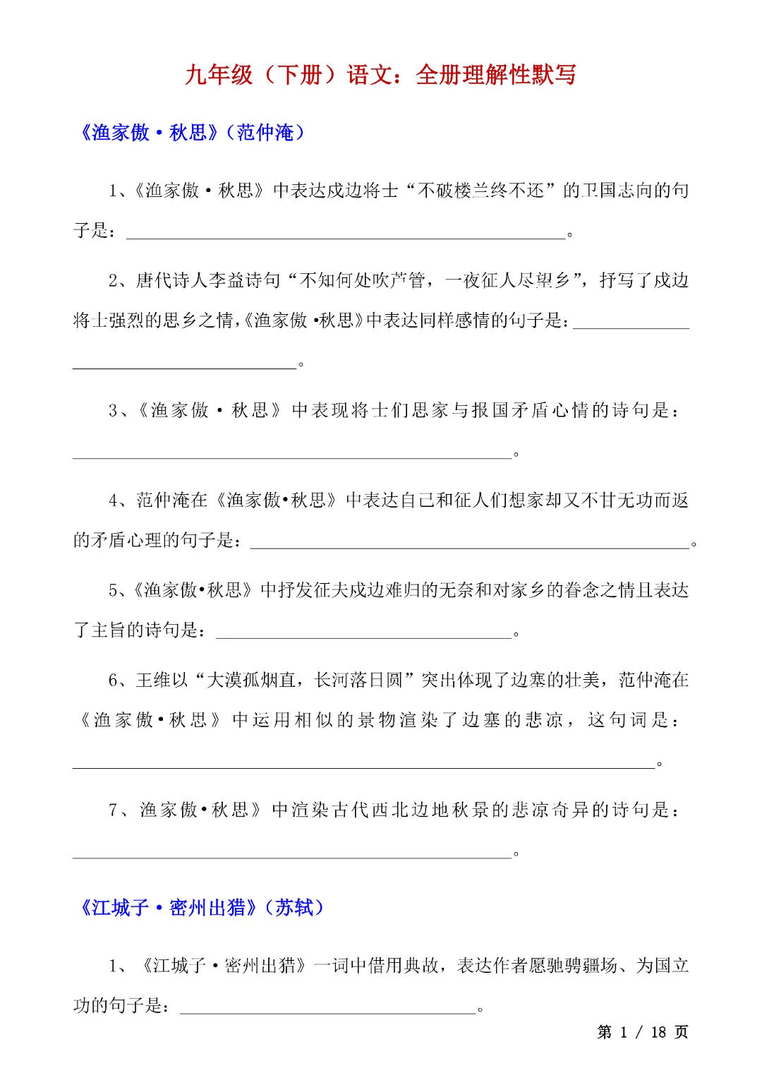 2026春人教部编版九年级下册语文《全册理解性默写》,含详细答案共18页,电子版可打印可下载。围绕初三下册课本,帮助孩子夯实学科基础,培养孩子逻辑思维,提升知识综合运用能力与应试技巧,助力升学能力培养,从从容容的度过春季学期。欢迎转发分享到班级群, 需要的家长们和老师们抓紧领取一份吧。
