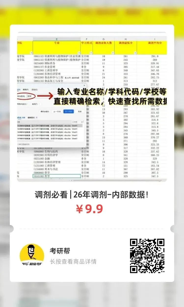 调剂必看 | 26年考研调剂-内部数据【免费下载】 风采展示 ▶此资料极其珍贵: 完美记录了历年所有高校调剂最高分,最低分,调剂人数,调剂平均分等数据,所有专业都有。 真正做到数据在手,调剂无忧,调剂不求人! 数据展示 如何免费领取? 👇👇👇 长按扫码,立即加入 (篇幅有限,仅列举部分) · · · (不愿转发?直接付费即可) 本次资料由互联网用户贡献,供需要的用户领取作私下学习、交流用途。公众号大部分学习资源已获得版权授权,小部分由网络整理无法联系到原作者,如有侵权可后台回复:“客服”,联系客服,我们将竭诚处理哦。🙂 免费领取步骤 1、点击下方:关注公众号 2、公众号内回复:333