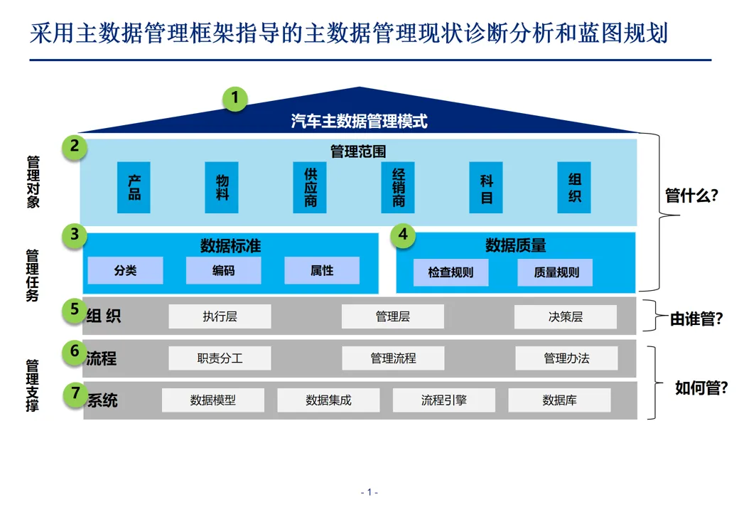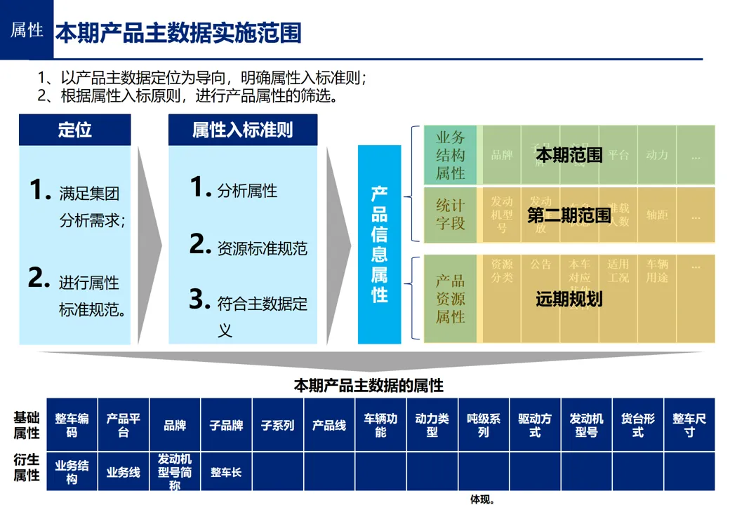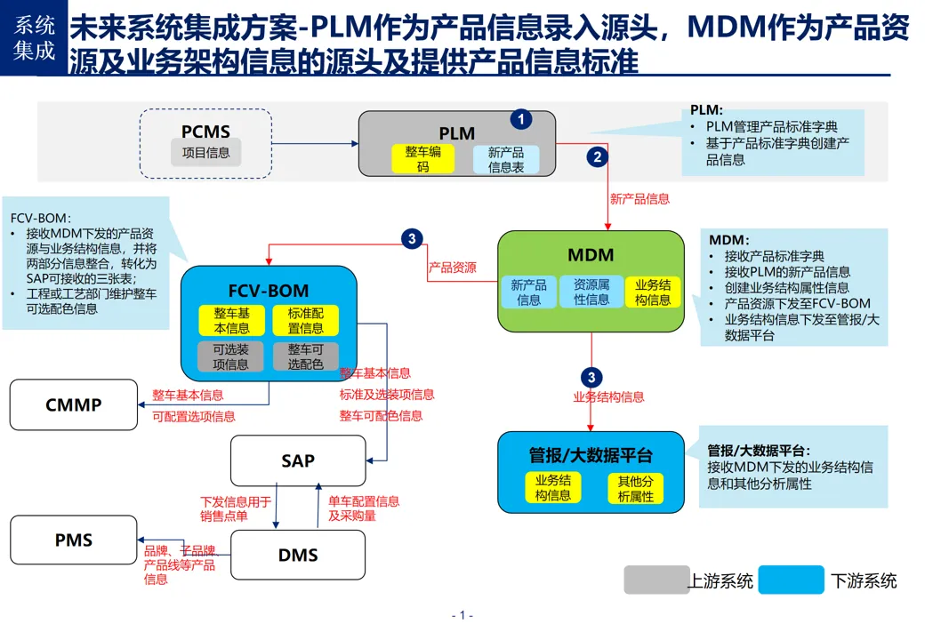 产品主数据:明确汽车行业产品主数据涵盖车型、单车配置等范围,梳理 173 个属性并分类为项目、技术、资源等 5 类。采用集中型与联邦型结合的管理模式,以 16 位整车编码为核心编码规则,搭建从 PLM 到 MDM 再到下游系统的集成架构,规范创建、冻结等管理流程。