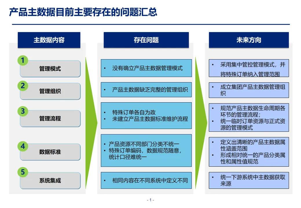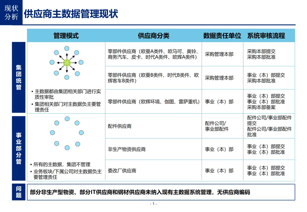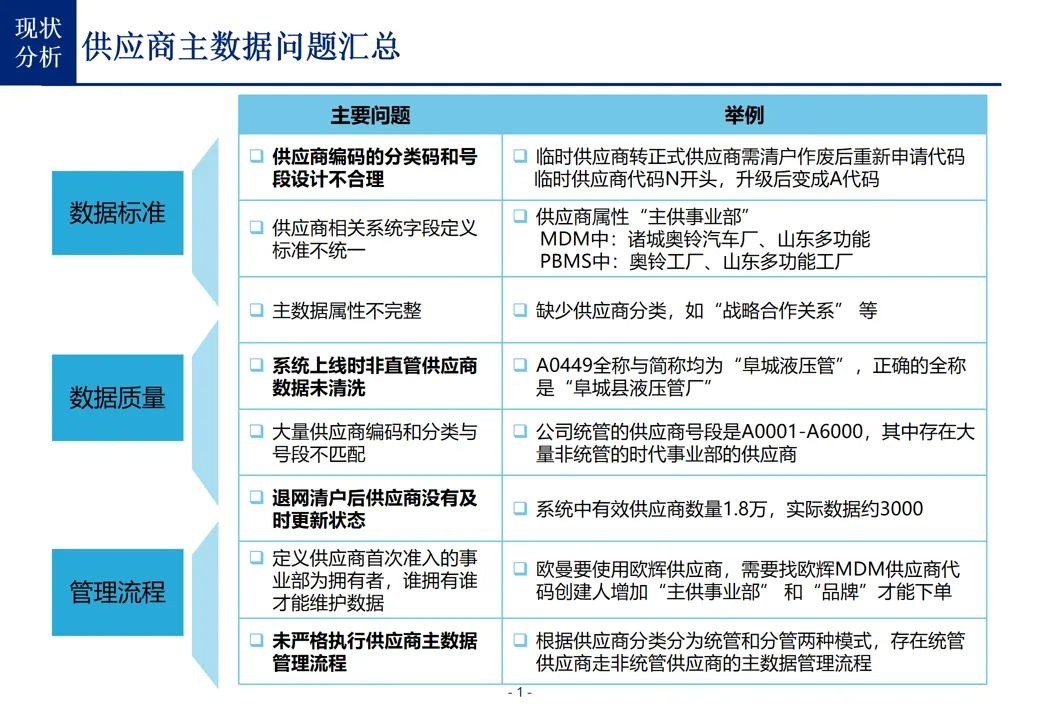 优化路径:建立集团级数据治理组织体系,制定统一的分类、编码、属性标准;搭建 MDM 统一管理平台,打通与业务系统的集成接口;完善数据全生命周期管理流程,建立数据质量考核机制;分阶段推进历史数据清洗与系统改造。