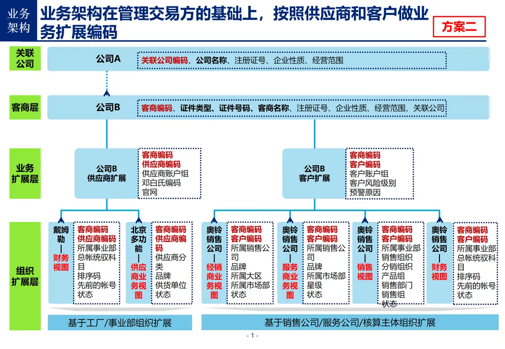 客商主数据:涵盖供应商、经销商、服务商等上下游主体,选定 “客商编码 + 供应商编码 + 客户编码” 的业务架构方案,统一分类与编码规则,界定全局与局部属性范围。建立采购管理本部与分销管理部分工负责的组织架构,规范填报与审核流程,制定历史数据清洗与系统切换方案。