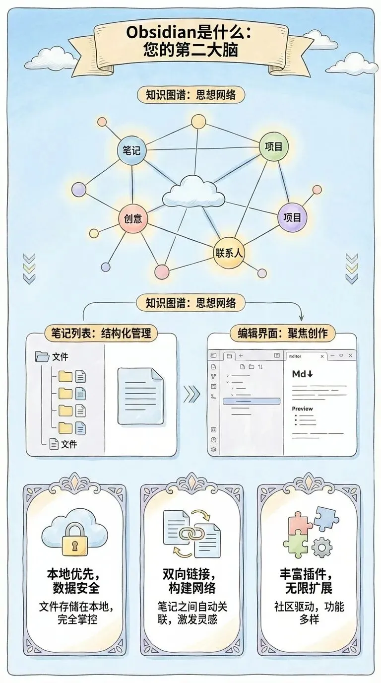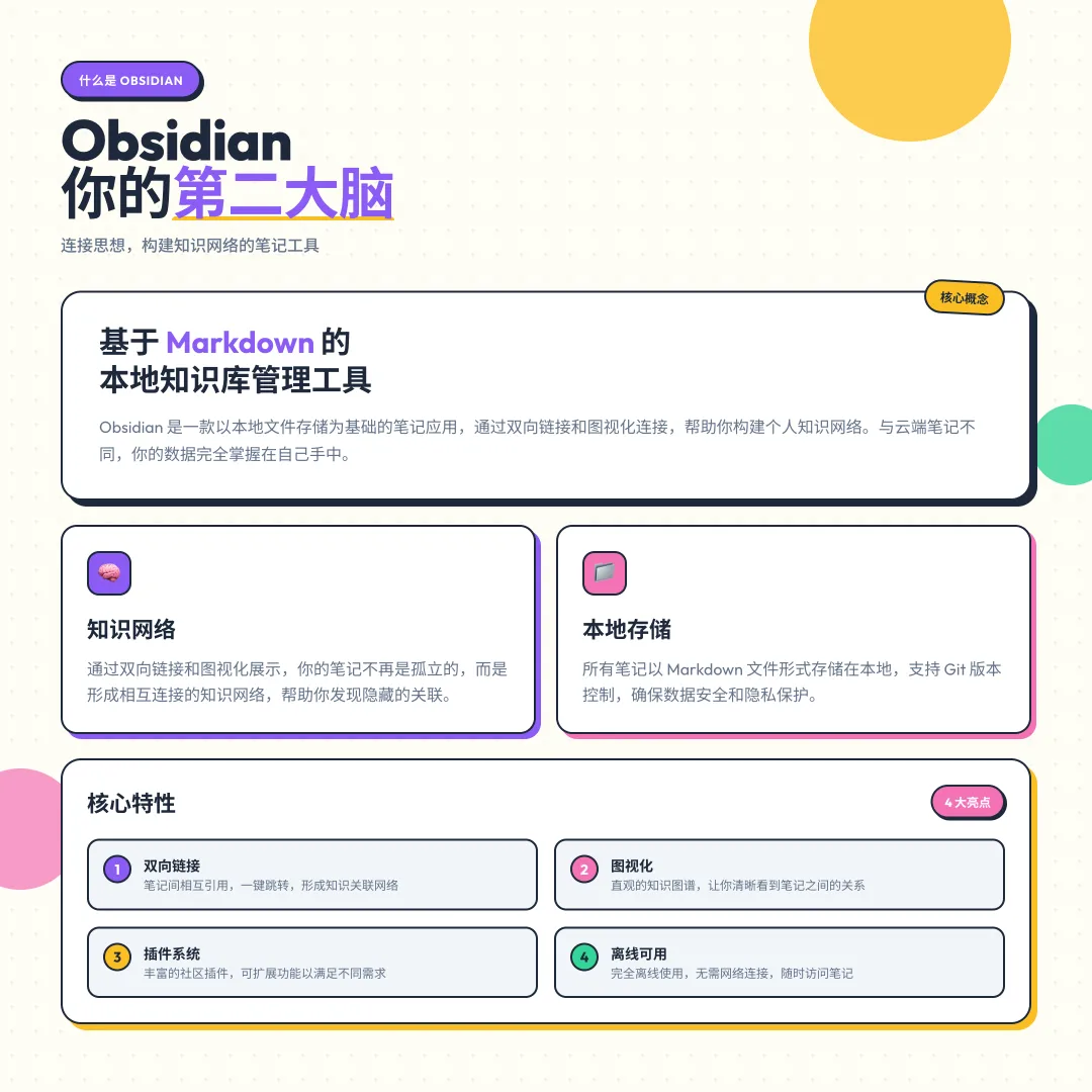 Obsidian 是一款强大的本地优先 Markdown 笔记应用,以其完全离线运行、双向链接和知识图谱功能,成为构建个人知识库的理想工具。它支持 Windows、MacOS、Linux 和移动端,让你可以随时随地访问自己的笔记。