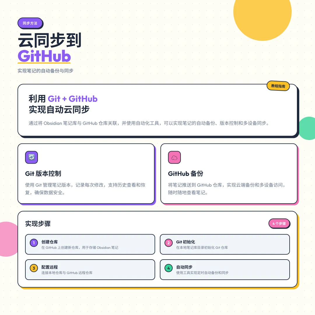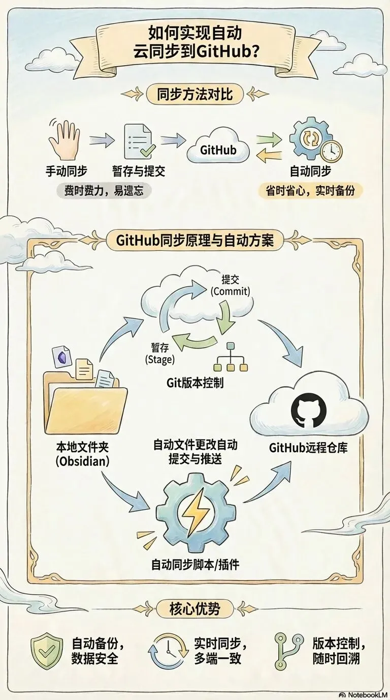 如果没有AI,想要实现 github 自动云备份的同步,你需要先建立一个私人仓库,获取密钥,然后把仓库克隆到本地,接着你需要把 Obsidian 的仓库和 github 做对接。