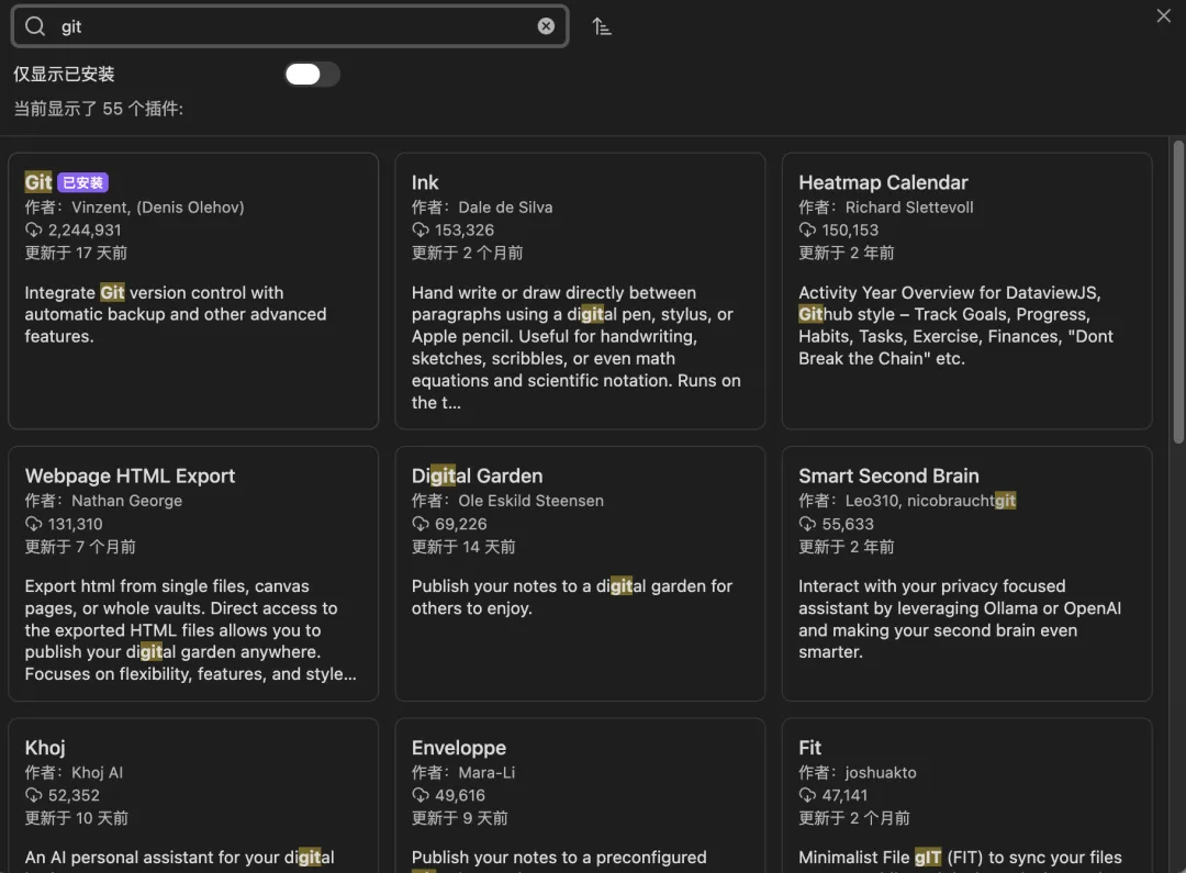 • 安装方法:在社区插件市场搜索 “Obsidian Git” 并安装 -