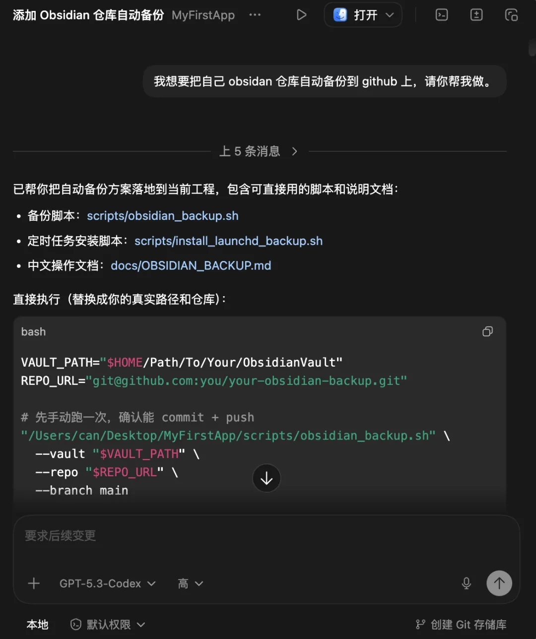 后台任务有权限报错,请把备份目录迁移到 ~/Obsidian 下并重配自动备份。