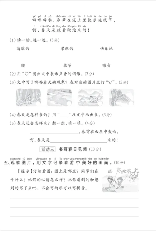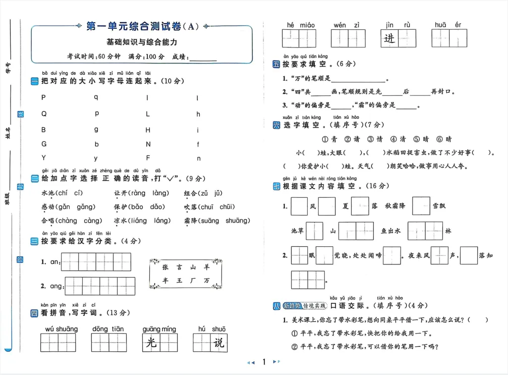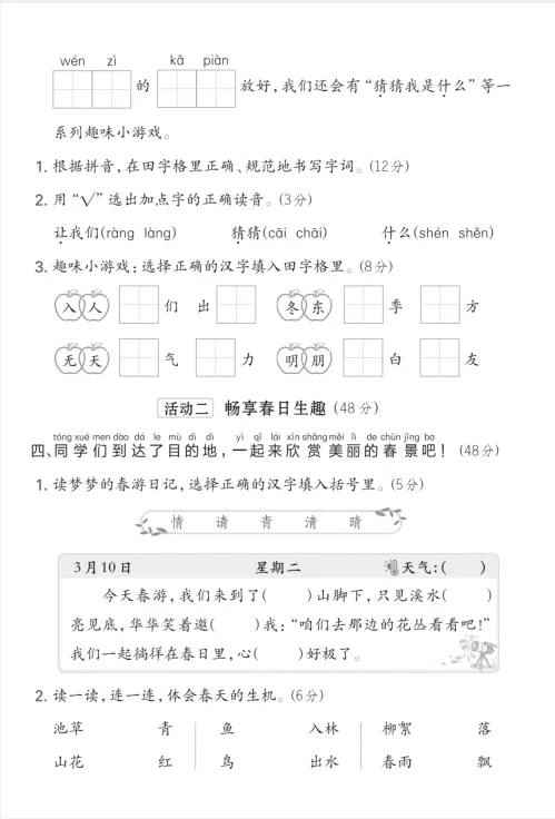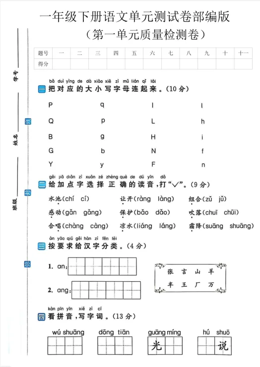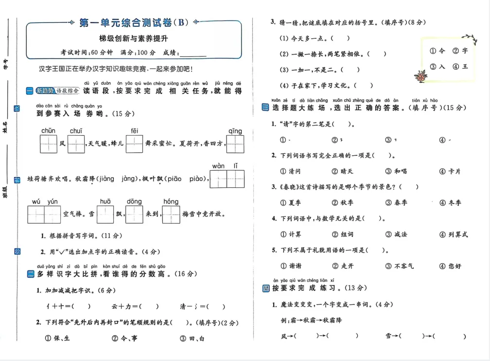 26春新一年级下册人教版(部编版)《语文第一单元测试卷》共4套,有答案,电子版可下载打印。基础能力巩固与检测,学习问题诊断与针对性提升,应试能力与习惯培养,综合素养提升。