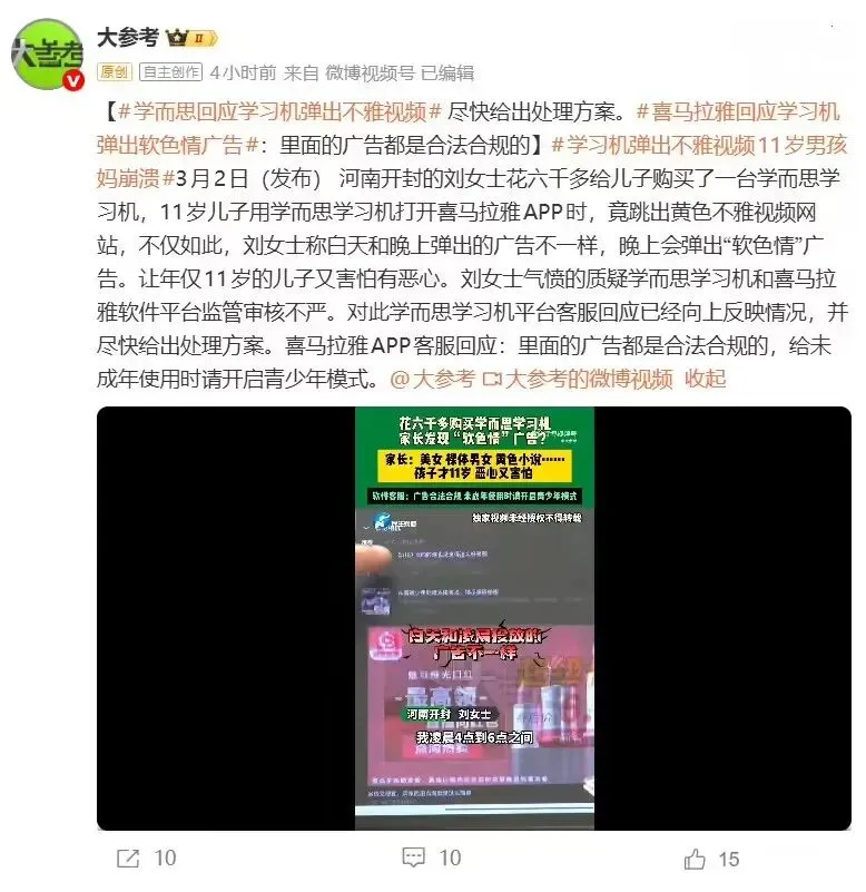 2026年3月2日,河南开封的刘女士花六千多给儿子购买了一台学而思学习机,11岁儿子用学而思学习机打开喜马拉雅 App时,竟跳出不雅视频网站。不仅如此,刘女士称白天和晚上弹出的广告不一样,晚上会弹出“软色情”广告。刘女士气愤地质疑学而思学习机和喜马拉雅软件平台监管审核不严。