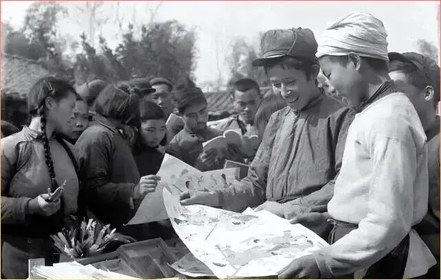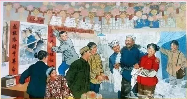 年关将.至,村里最热.闹的就是供销社.门口了。瞧瞧这.幅.年画,满屋子的人挤得水泄不通,都在抢购.年货呢!那时.候能买到一张好看的年画贴门上,全家人都高兴得不.得.了。柜台后面的售货员忙得脚不沾地,算盘珠子噼里啪.啦响个不停,这场.景现在的.孩子们哪里见过?