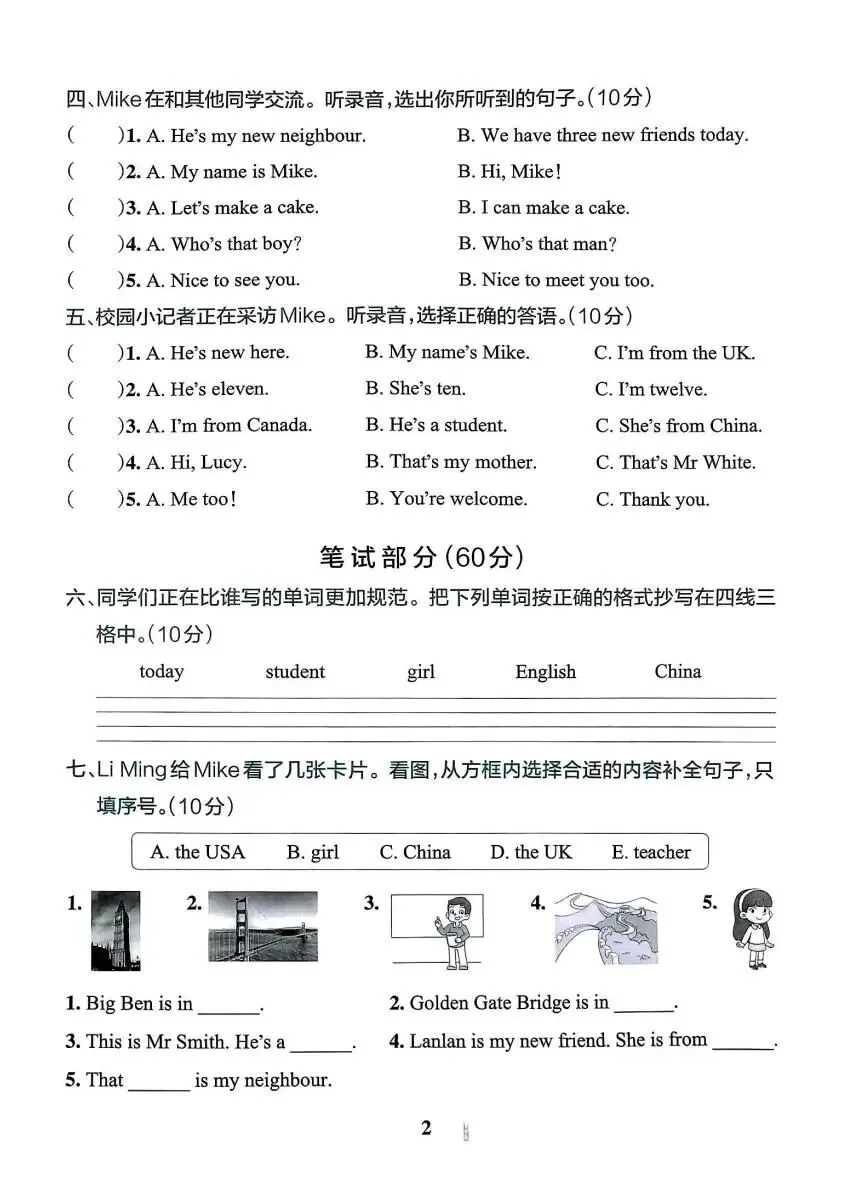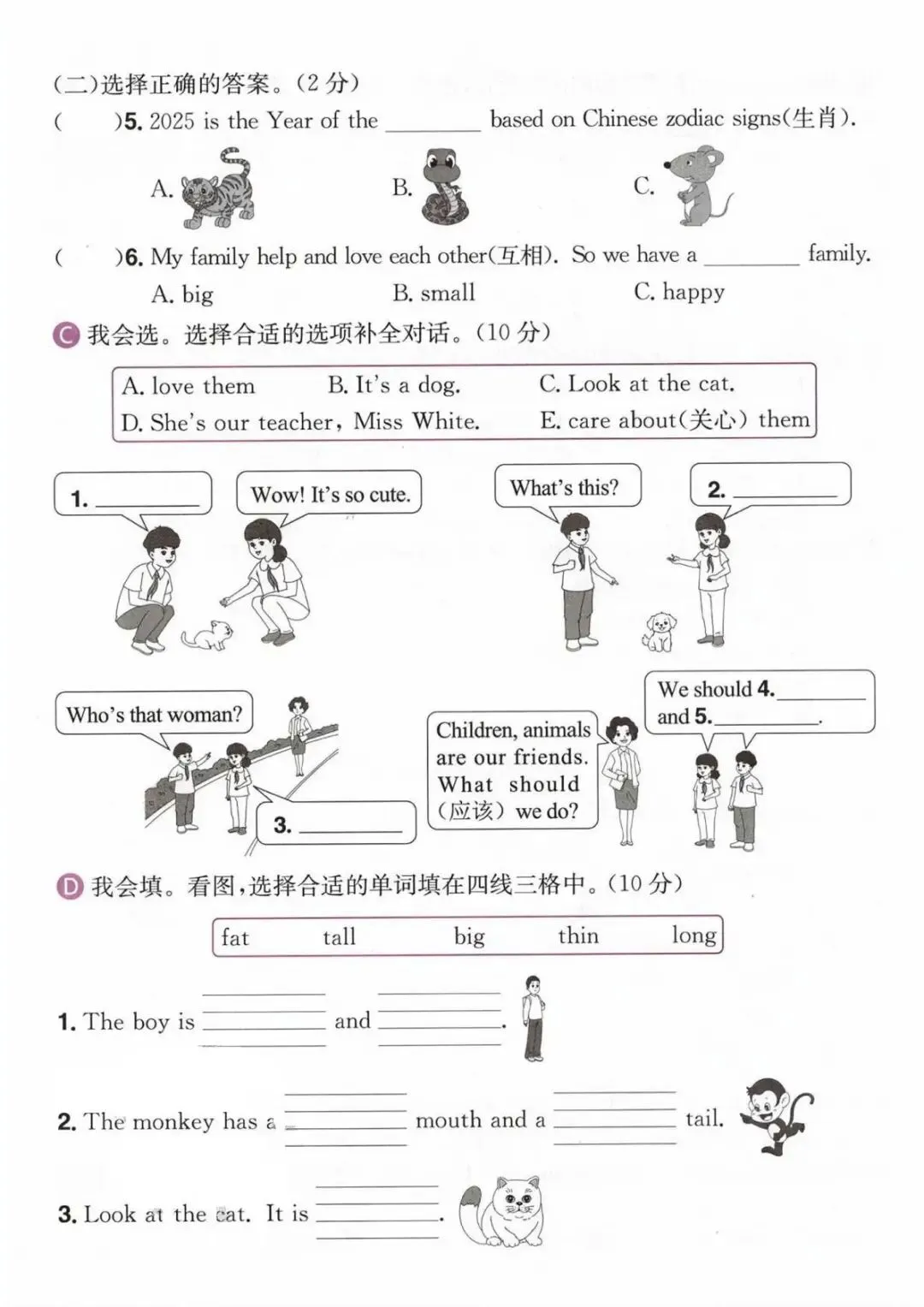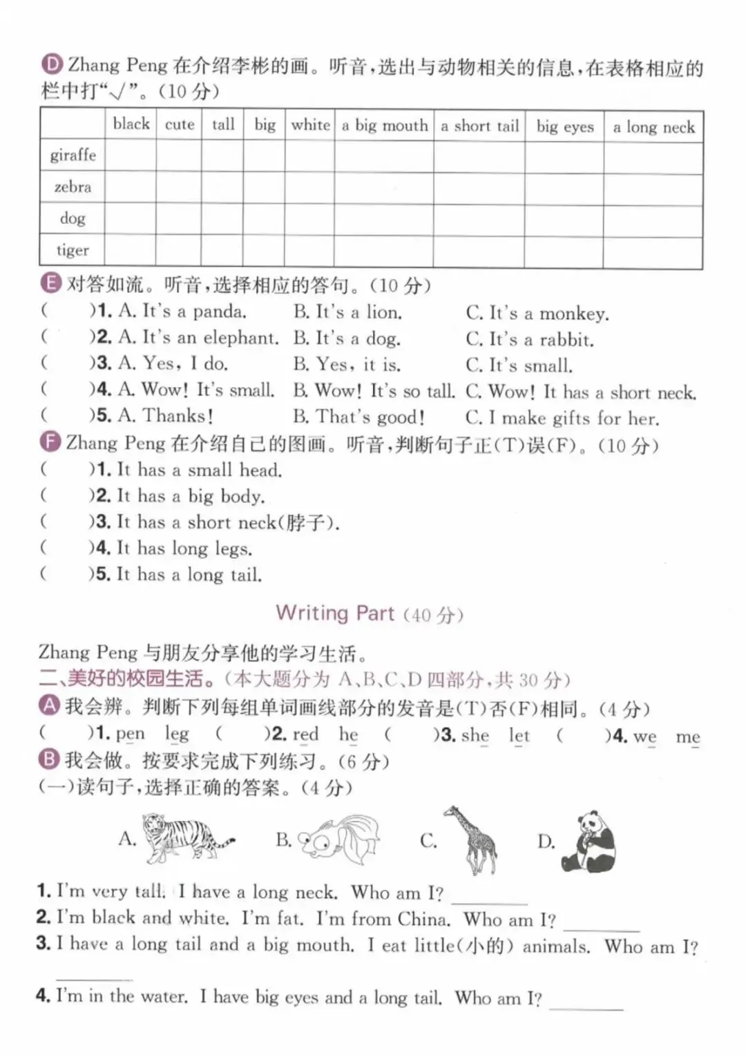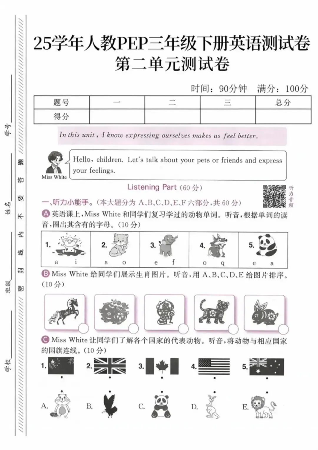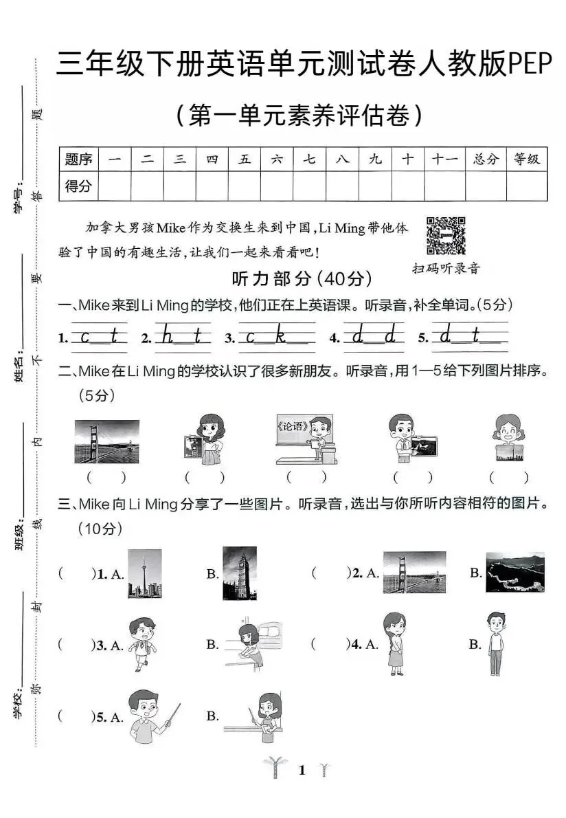 26年春季新《三年级下册人教PEP版第1-2单元测试卷》高清电子版可下载打印
