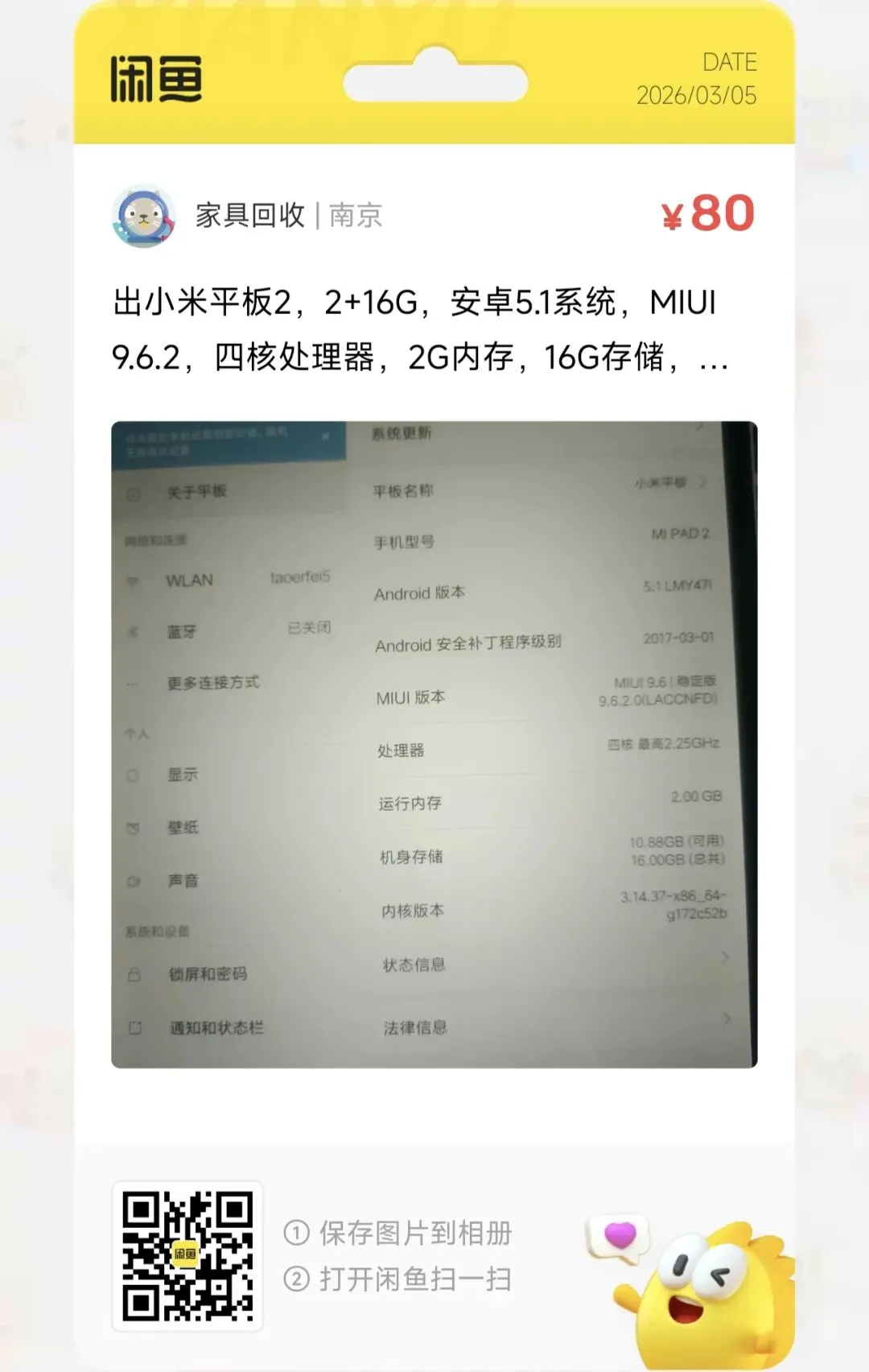 粉丝爆料分享了一台价格80元的小米平板2,2+16G,安卓5.1系统,MIUI 9.6.2
