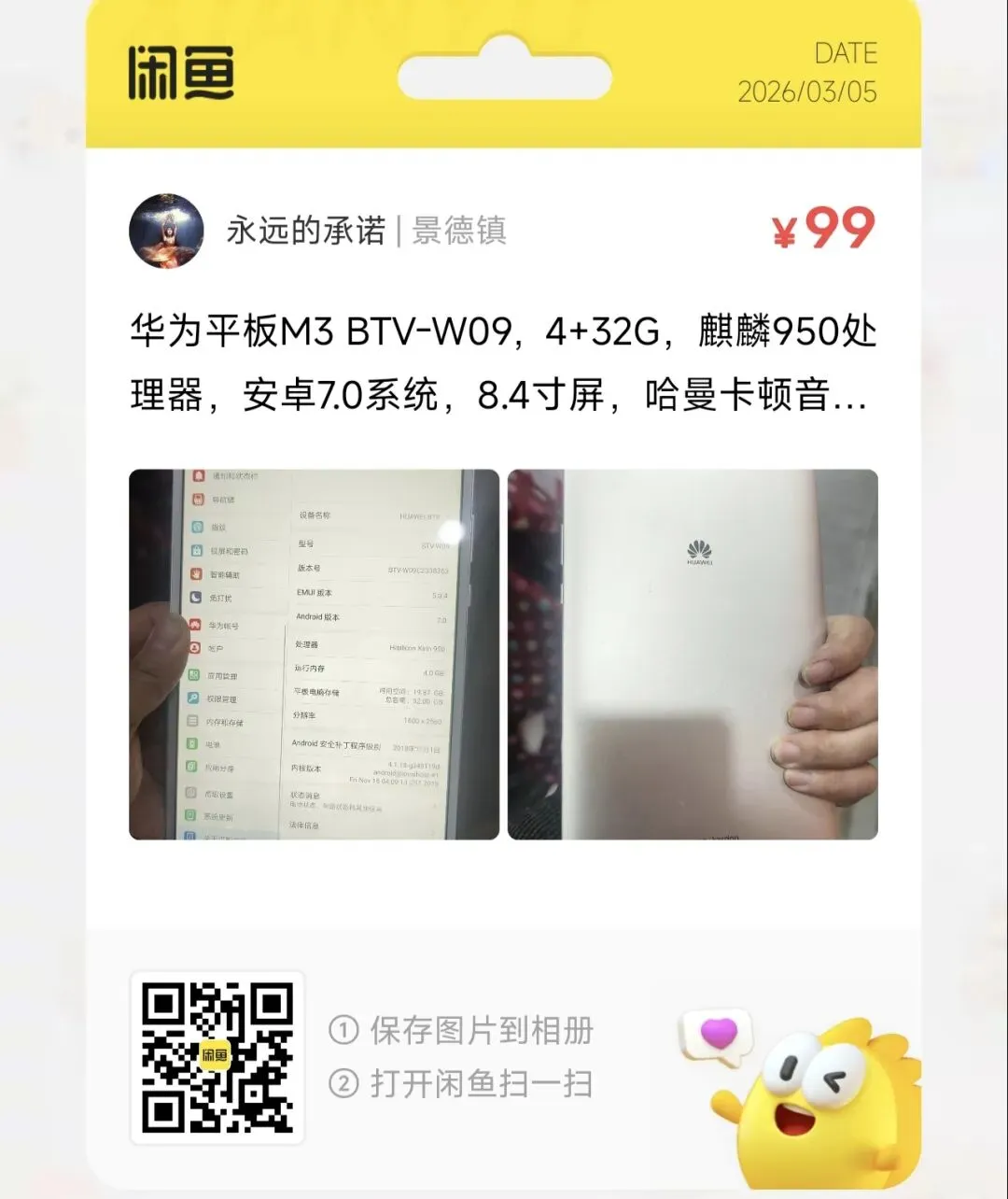 粉丝爆料分享了一台价格99元的华为平板M3 BTV-W09,4+32G,麒麟950处理器