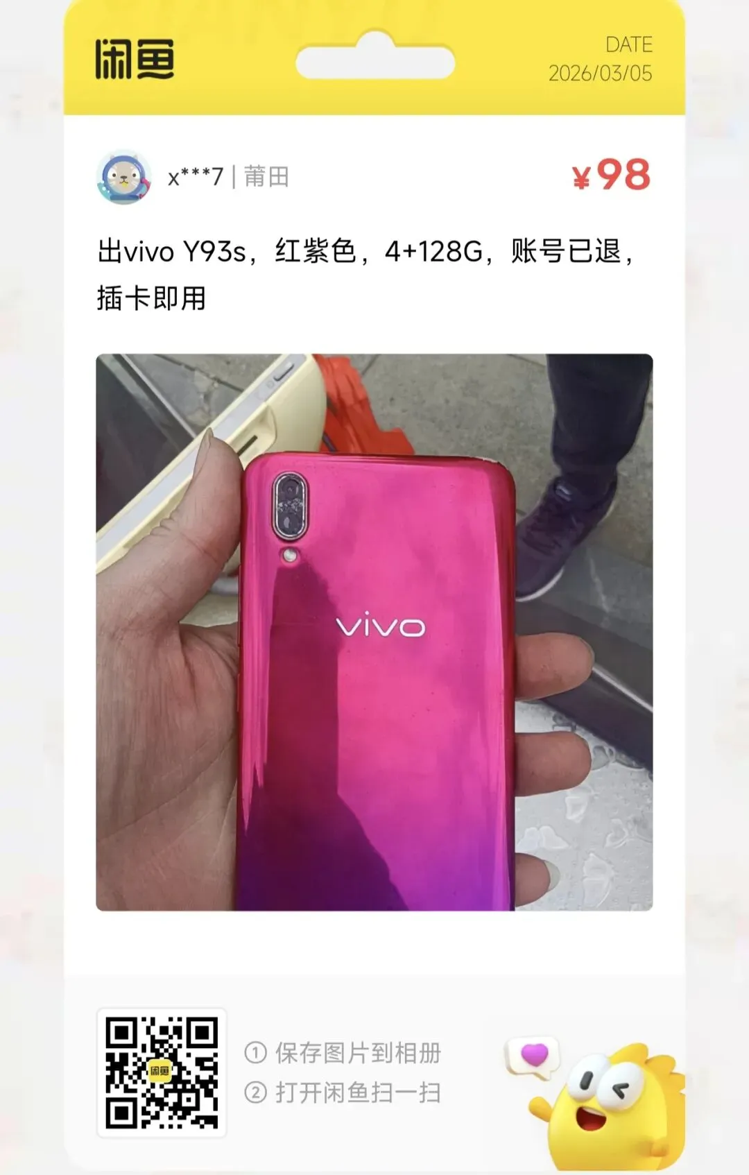 粉丝爆料分享了一台价格98元包邮的vivo Y93s,红紫色,4+128G,账号已退,插卡即用成色还可以,外观有点使用痕迹