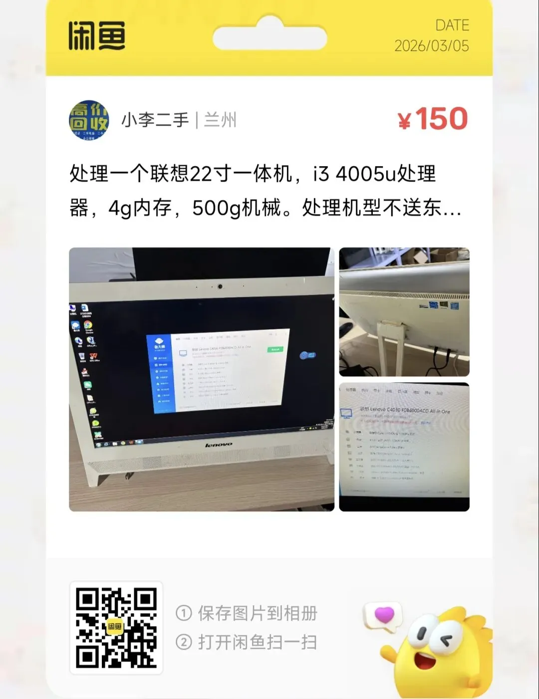 粉丝爆料分享了一台价格150元的联想22寸一体机,i3 4005u处理器,4g内存,500g机械